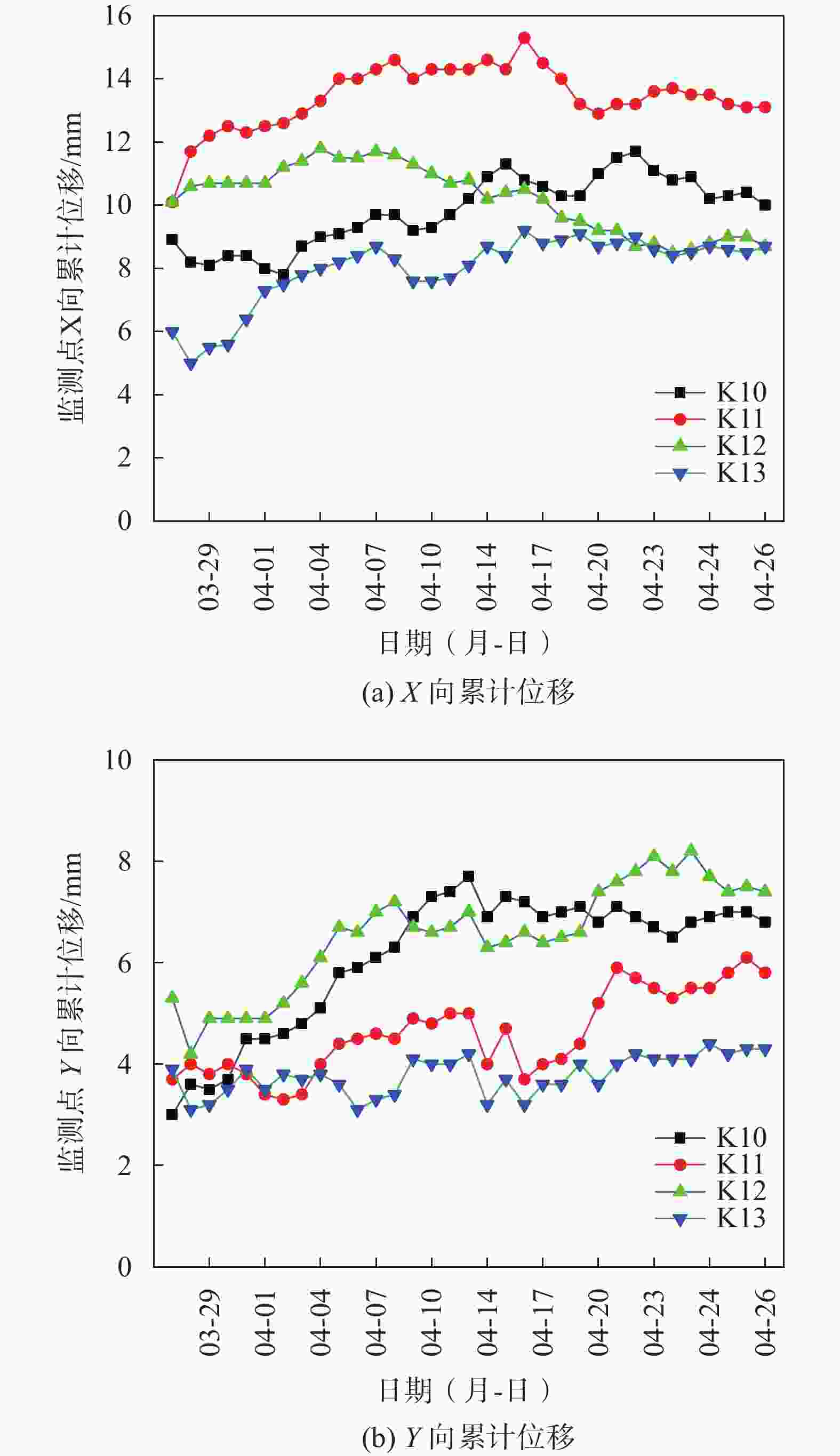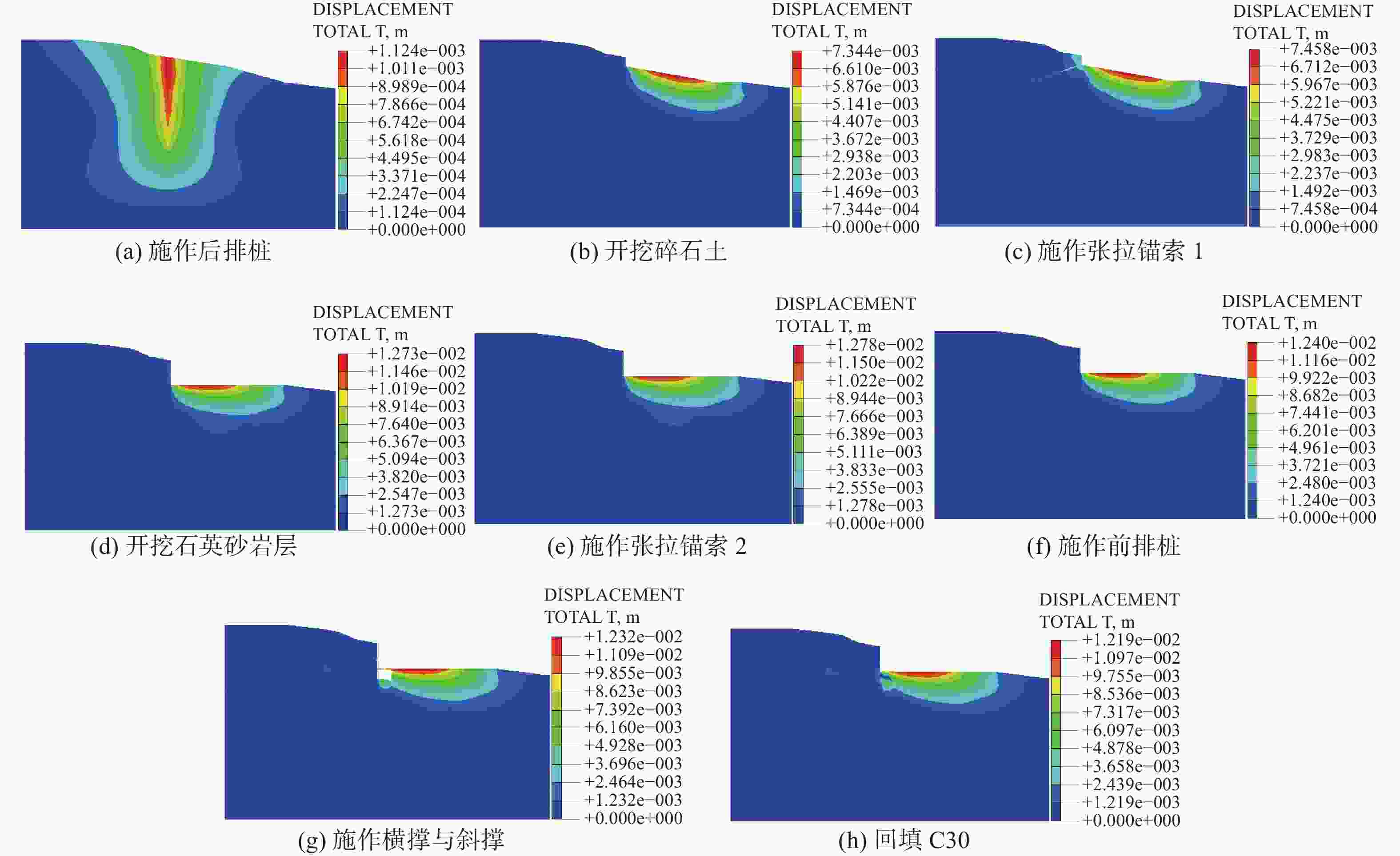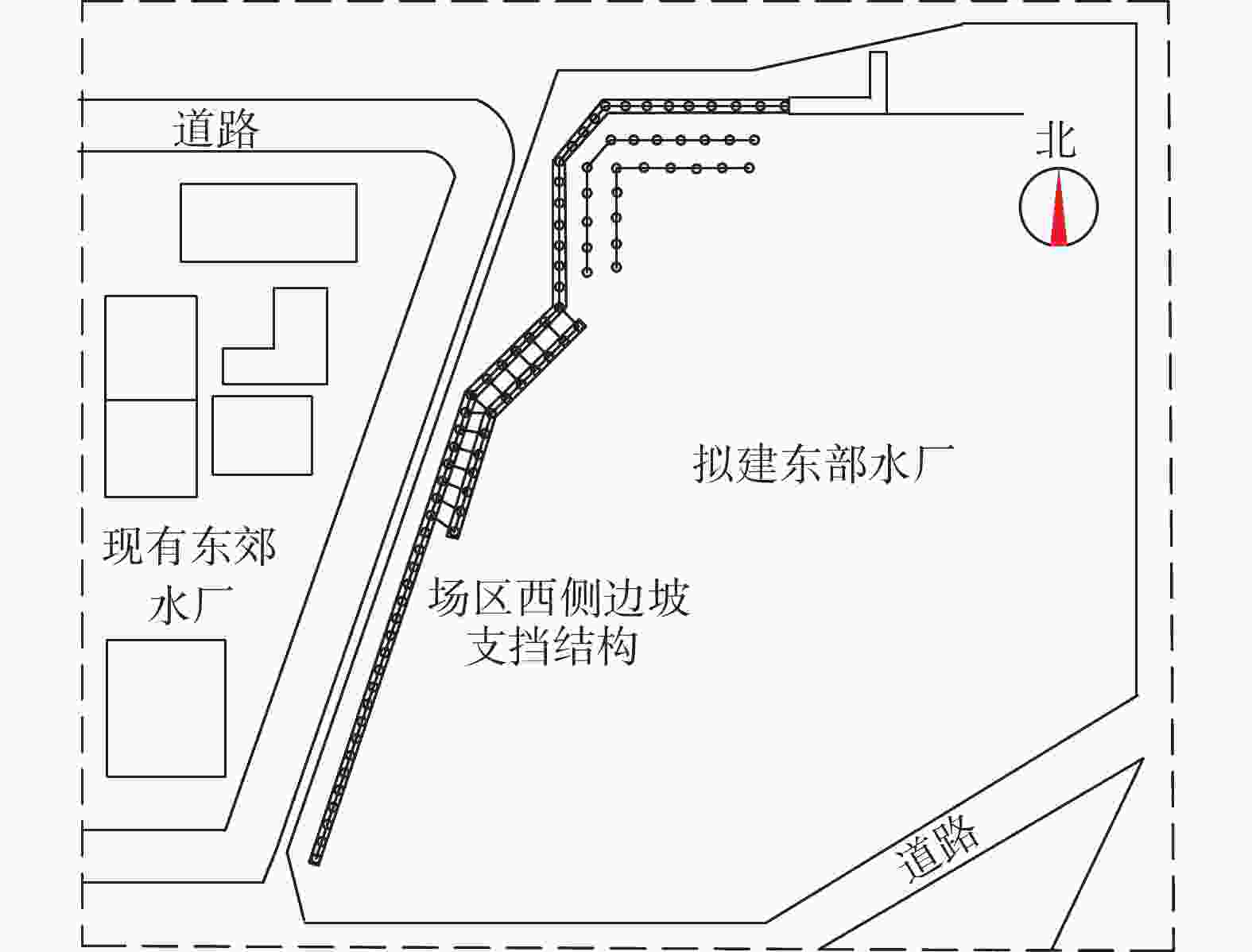 • 摘要: 贵阳某边坡工程受场地空间限制需直立开挖,因边坡上方邻近既有水厂建(构)筑物,需严格控制边坡变形,为此提出采用斜椅式桩锚支护体系。通过数值模拟分析了支护后边坡的稳定性、施工过程的位移控制以及支护结构的受力特征。结果表明,斜椅式桩锚支护体系受力合理、变形控制效果好。边坡监测结果显示,竣工后边坡各测点最大累计位移量均处于较小范围且趋于稳定,坡顶土体测斜曲线趋于收敛。东部水厂边坡工程竣工后运行状态良好,在满足场地空间的前提下,有效地保护了坡顶既有水厂的安全,所采用的斜椅式桩锚支护方案可供类似工程参考。