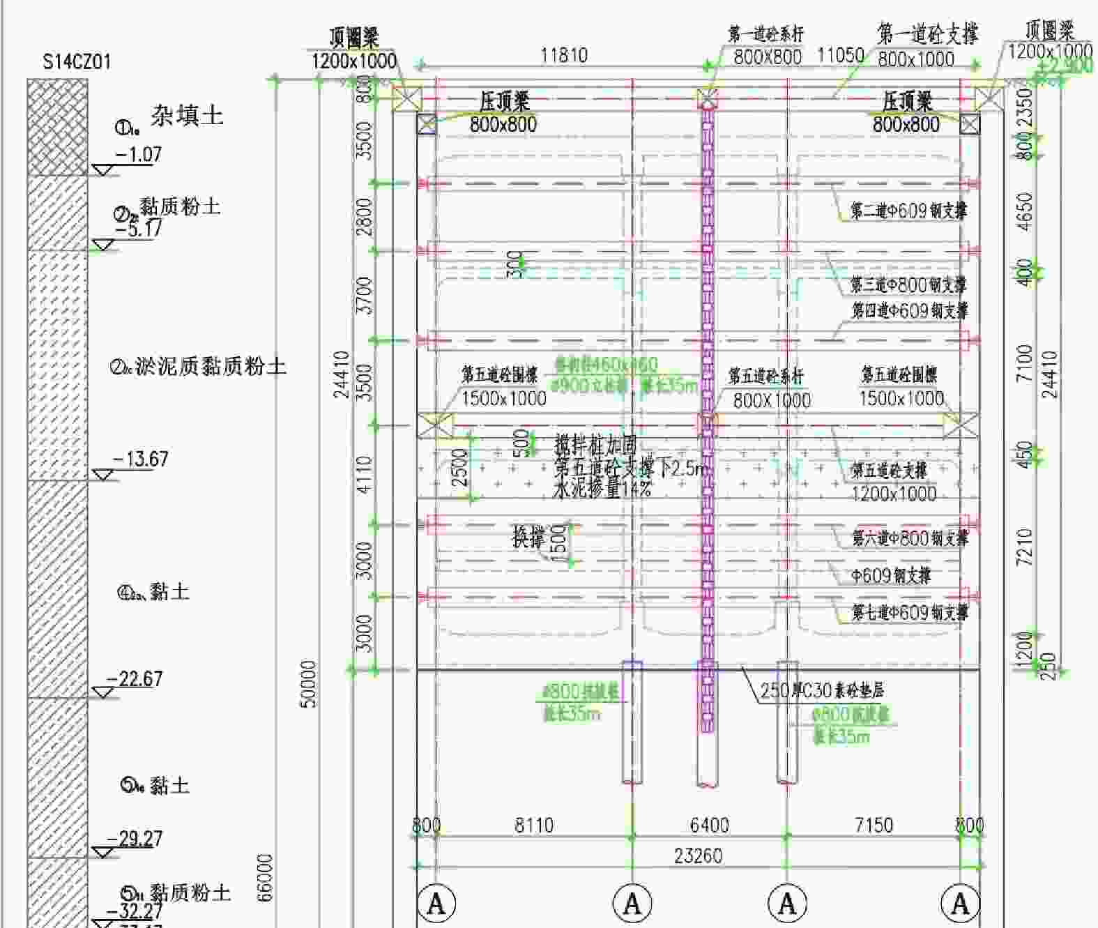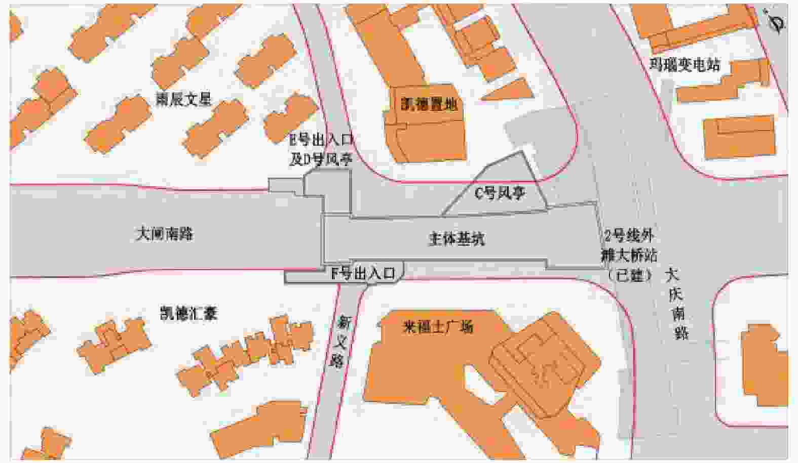 2 2号线1号出入口及风亭 位于车站北侧,紧邻基坑 钢筋混凝土结构,地下1层 ϕ800钻孔灌注桩基础 基坑底埋深8.76 m,