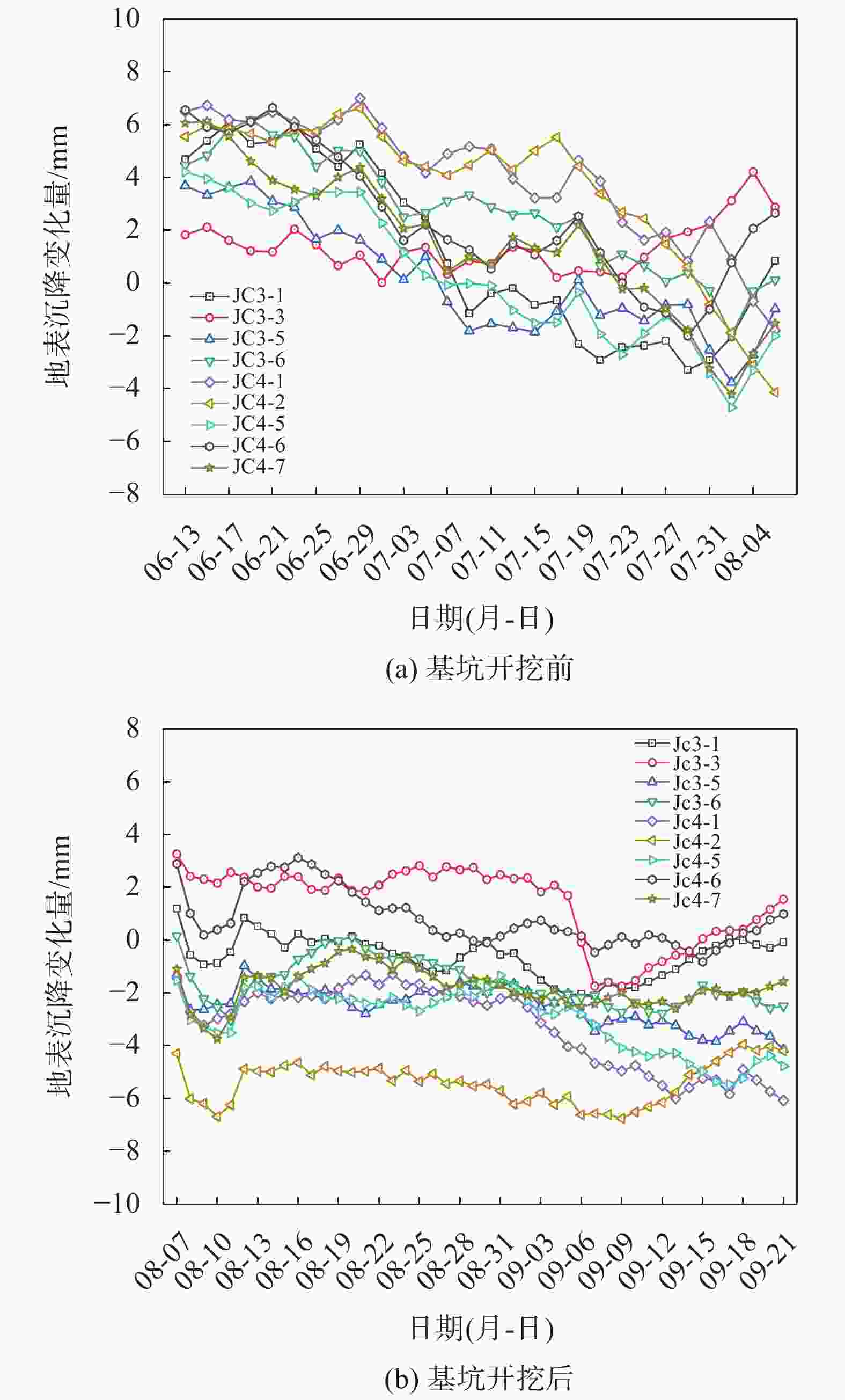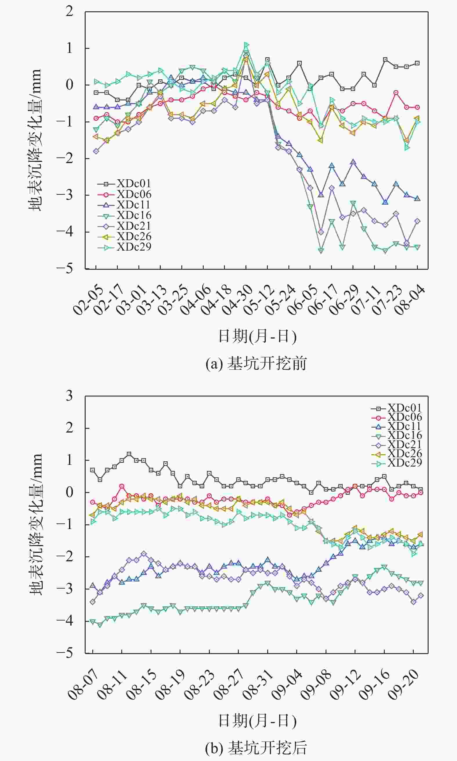 图  7  基坑开挖前后凯德置地沉降历时曲线