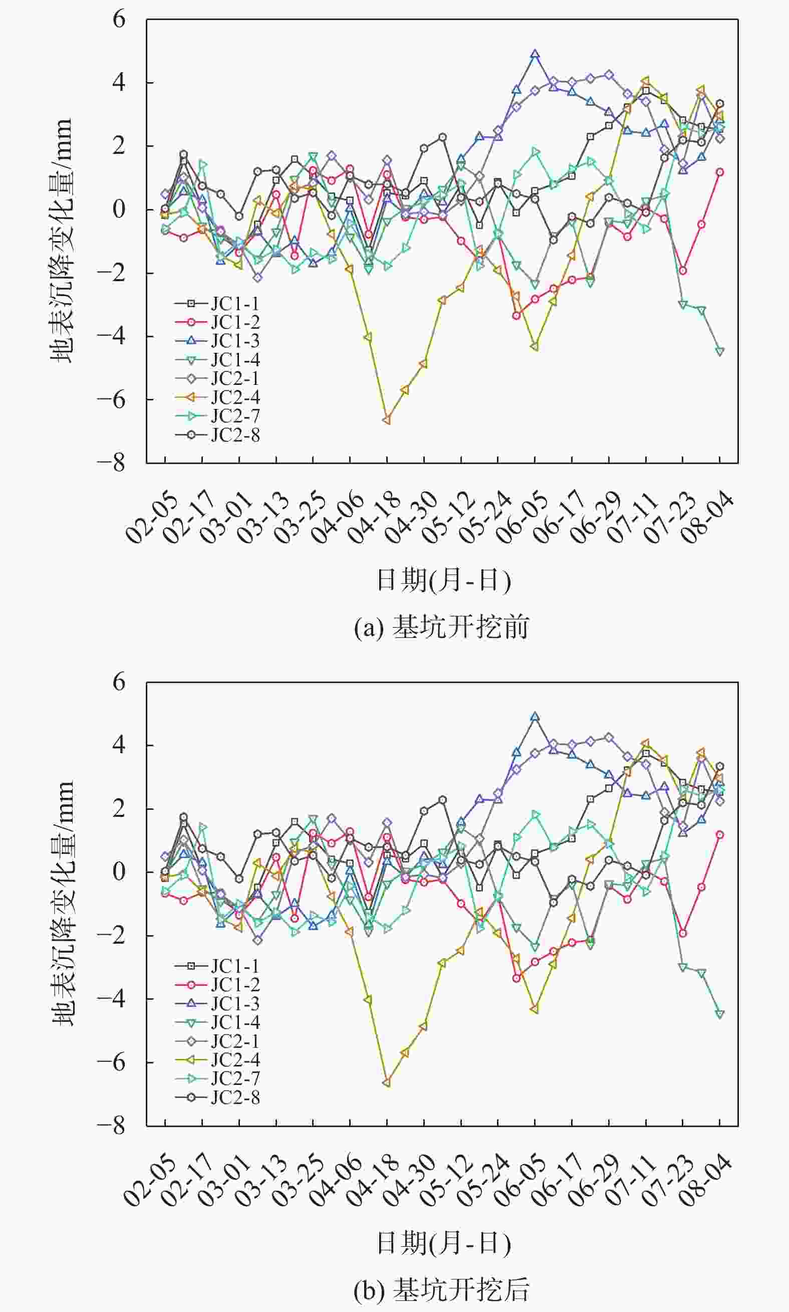 图  6  基坑开挖前后既有车站沉降历时曲线