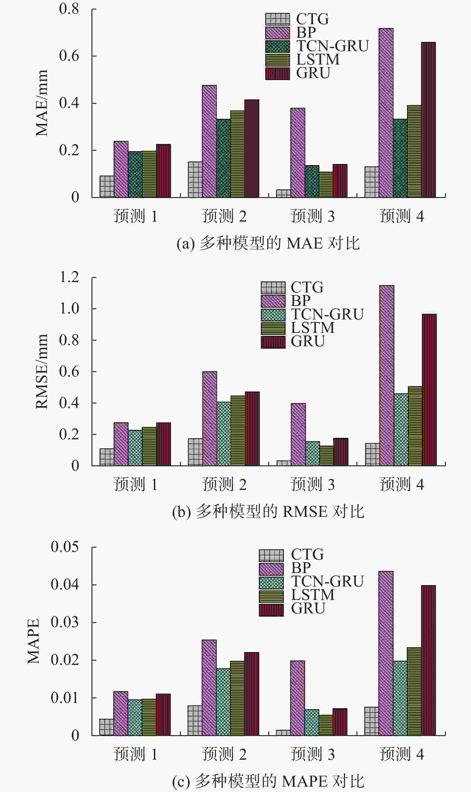模型 预测1 预测2 预测3 预测4 本文 0.0047 0.0083 0.0018 0.0079 BP 0.0121 0.0258 0.0202 0.0440 GRU 0.0099 0.0181 0.0073 0.0202 LSTM 0.0101 0.0201 0.0058 0.0237 TCN-GRU 0.0115 0.0225 0.0076 0.0402 -