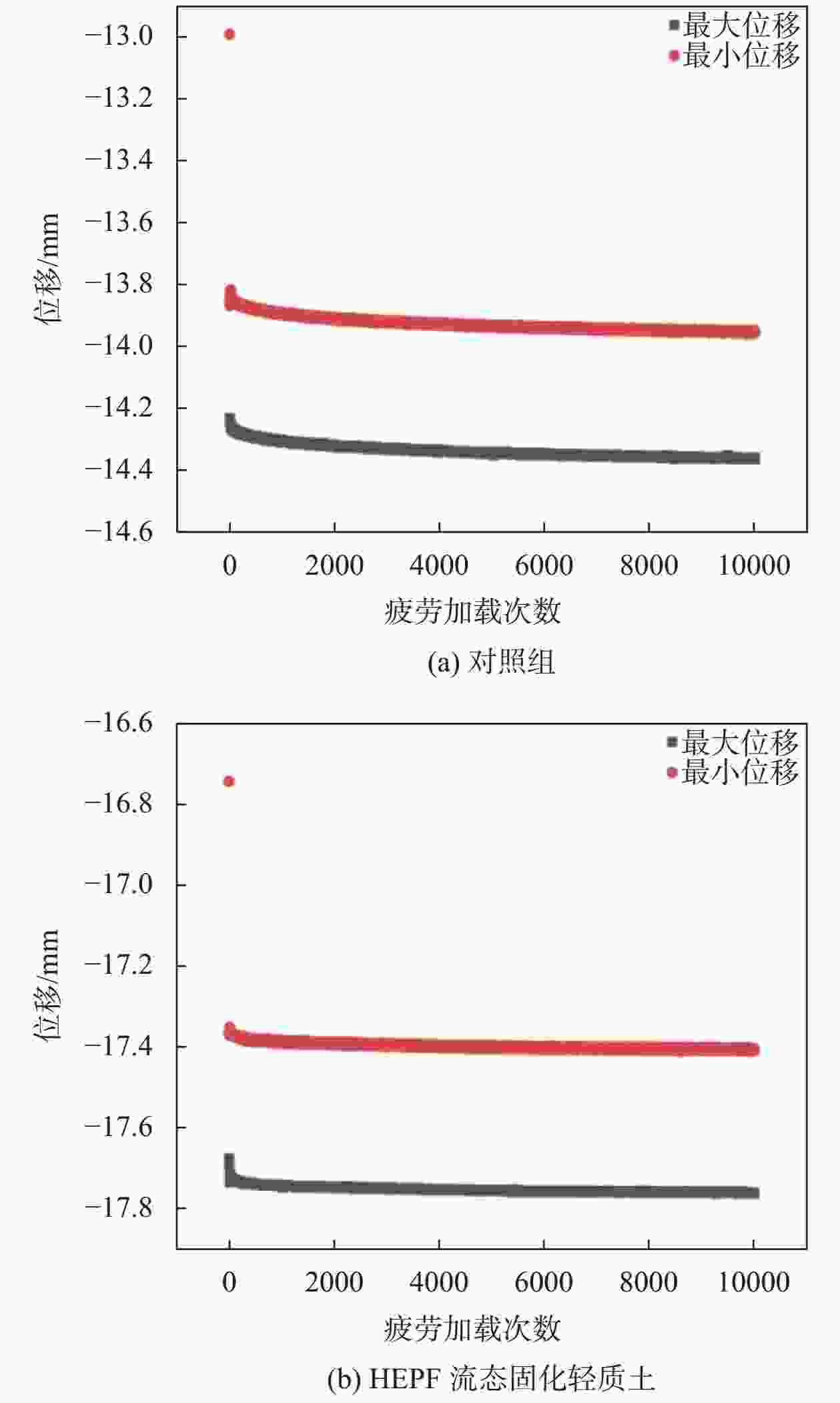 图  13  对照组及HEPF流态固化轻质土疲劳加载试验位移变化规律图