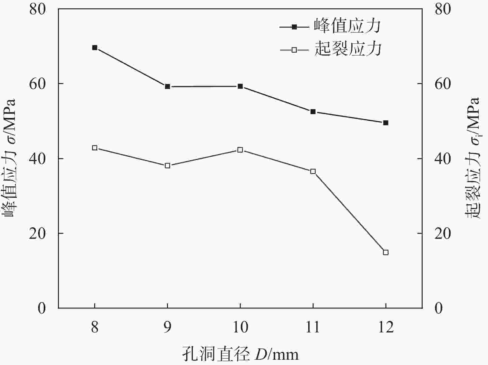 图  13  试样峰值应力与起裂应力随孔洞直径变化曲线