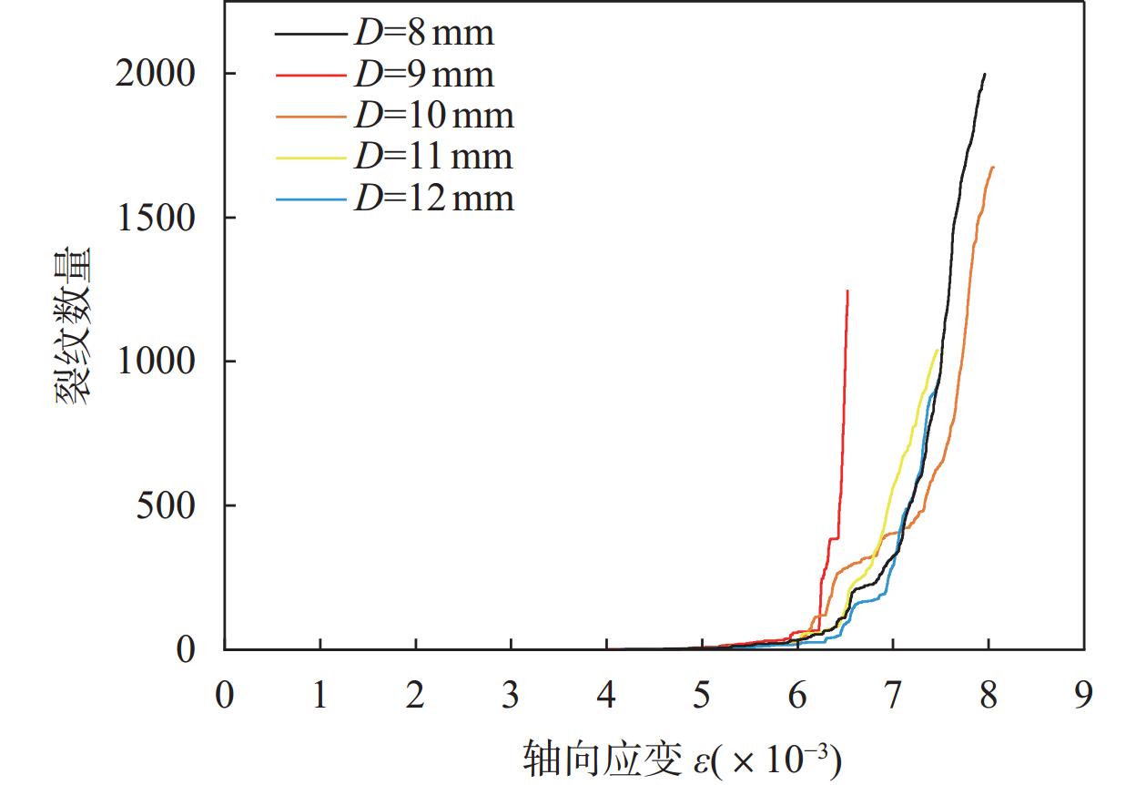 图  15  含不同孔洞直径砂岩裂纹数量随轴向应变变化曲线