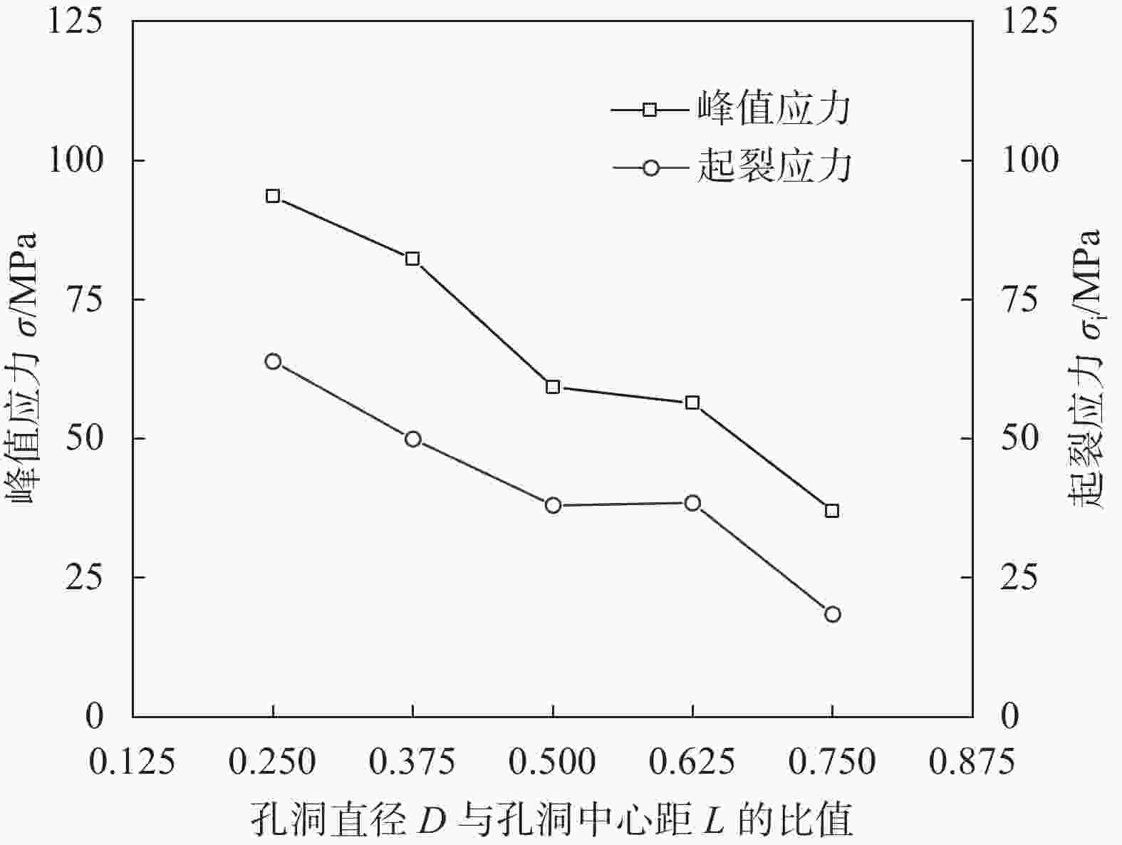 图  7  试样峰值应力和起裂应力随孔洞直径D与孔洞中心距L比值变化曲线