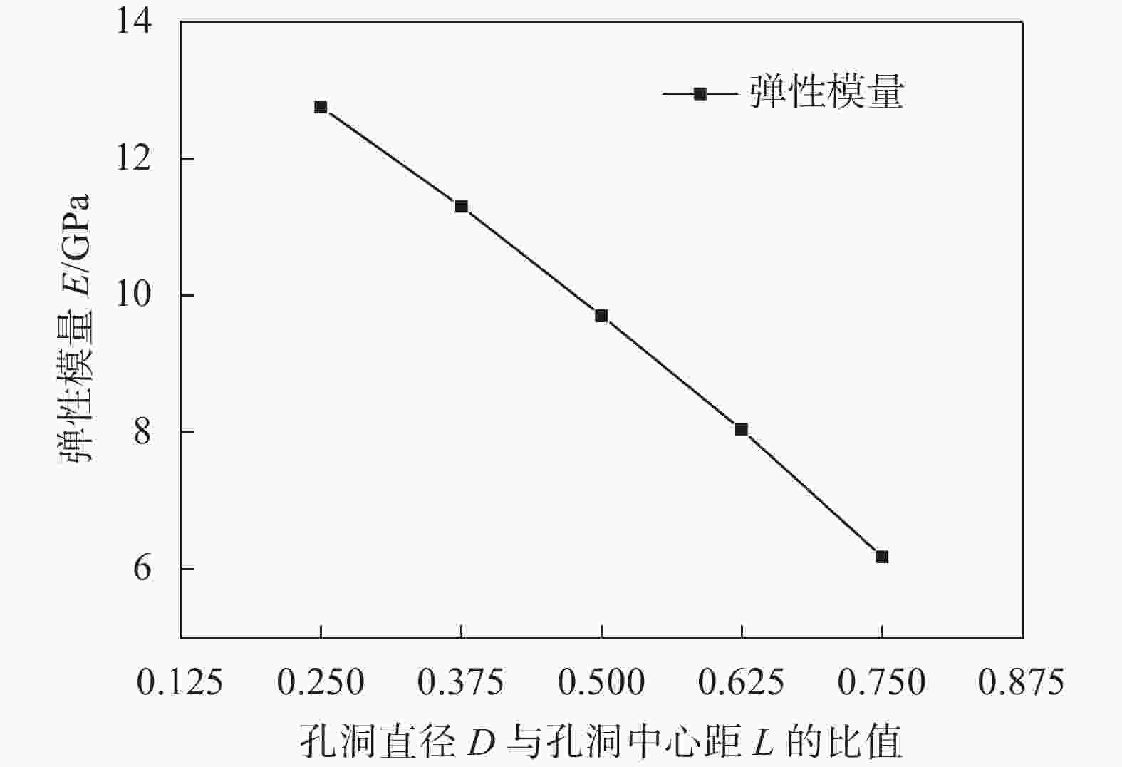 图  8  试样弹性模量随孔洞直径D与其中心距L比值变化曲线