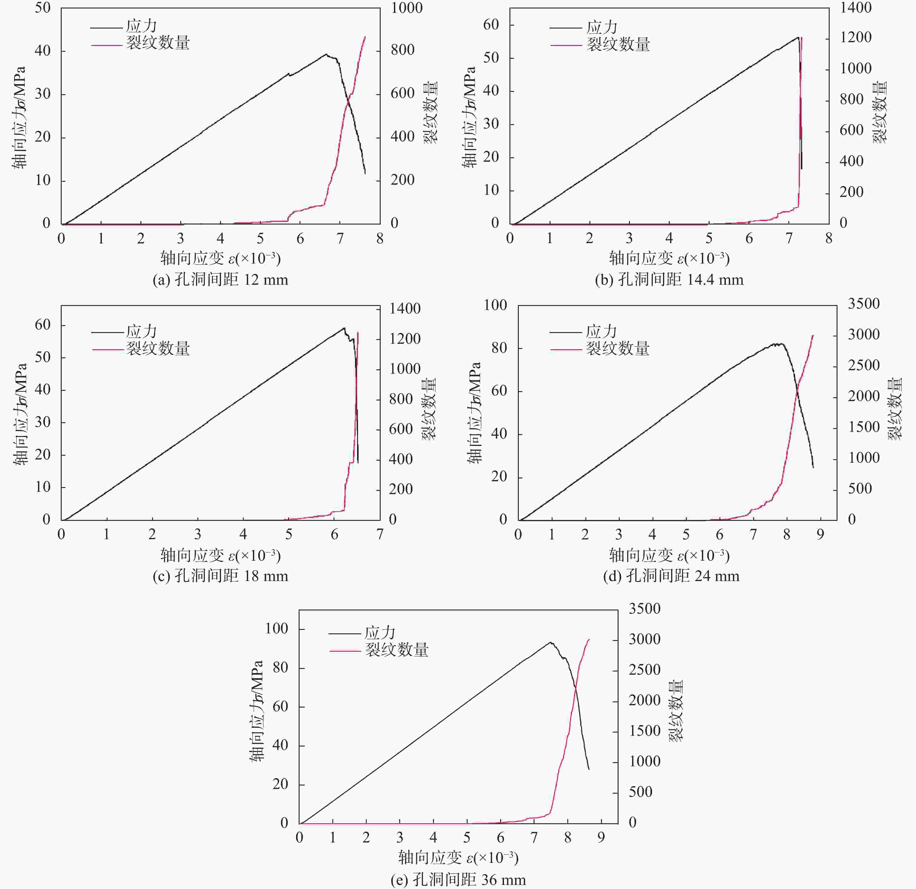 图  9  不同孔洞间距时试样应力−应变−微裂纹数量曲线