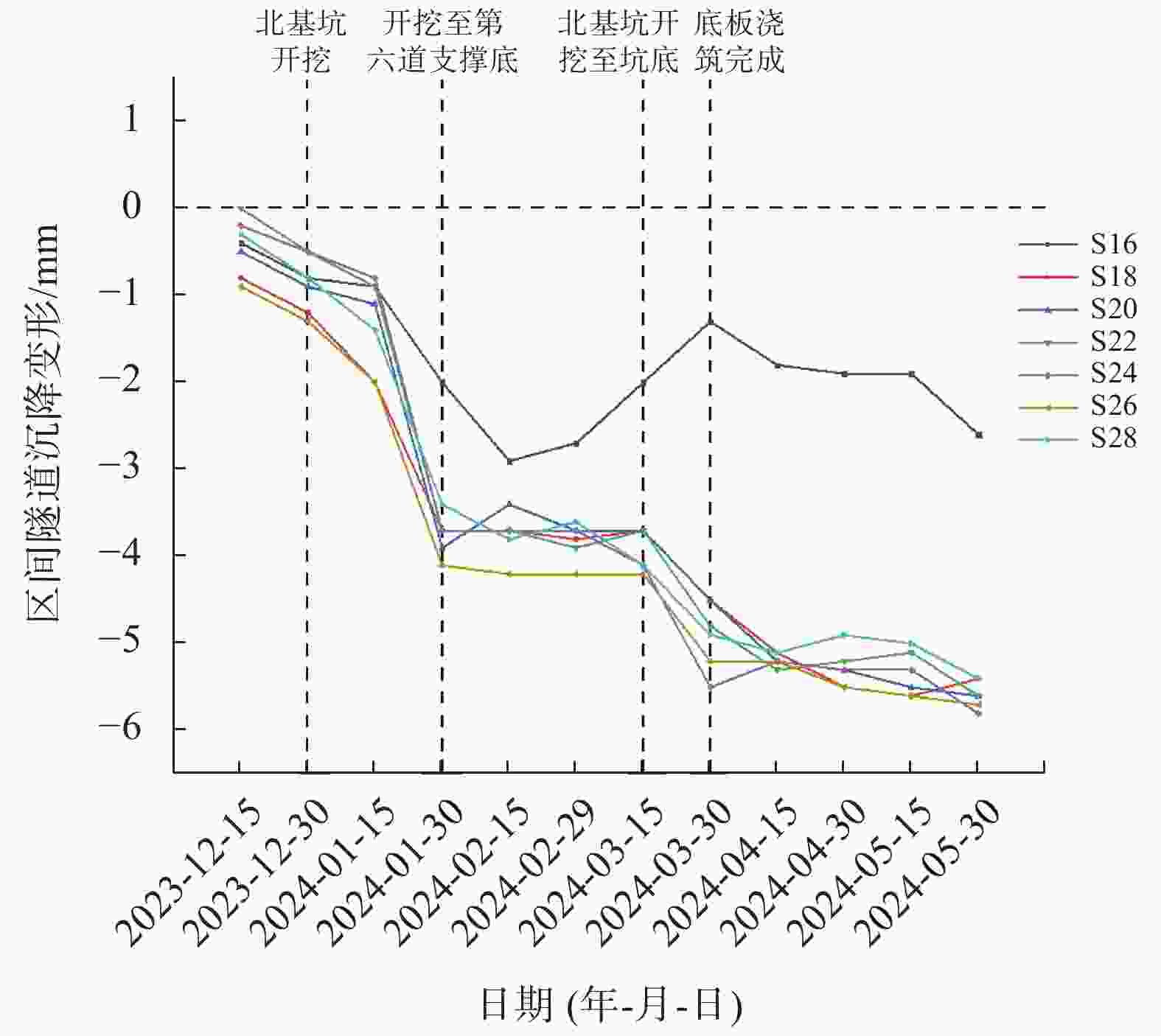 图  10  南基坑开挖期间区间隧道沉降随时间变化图