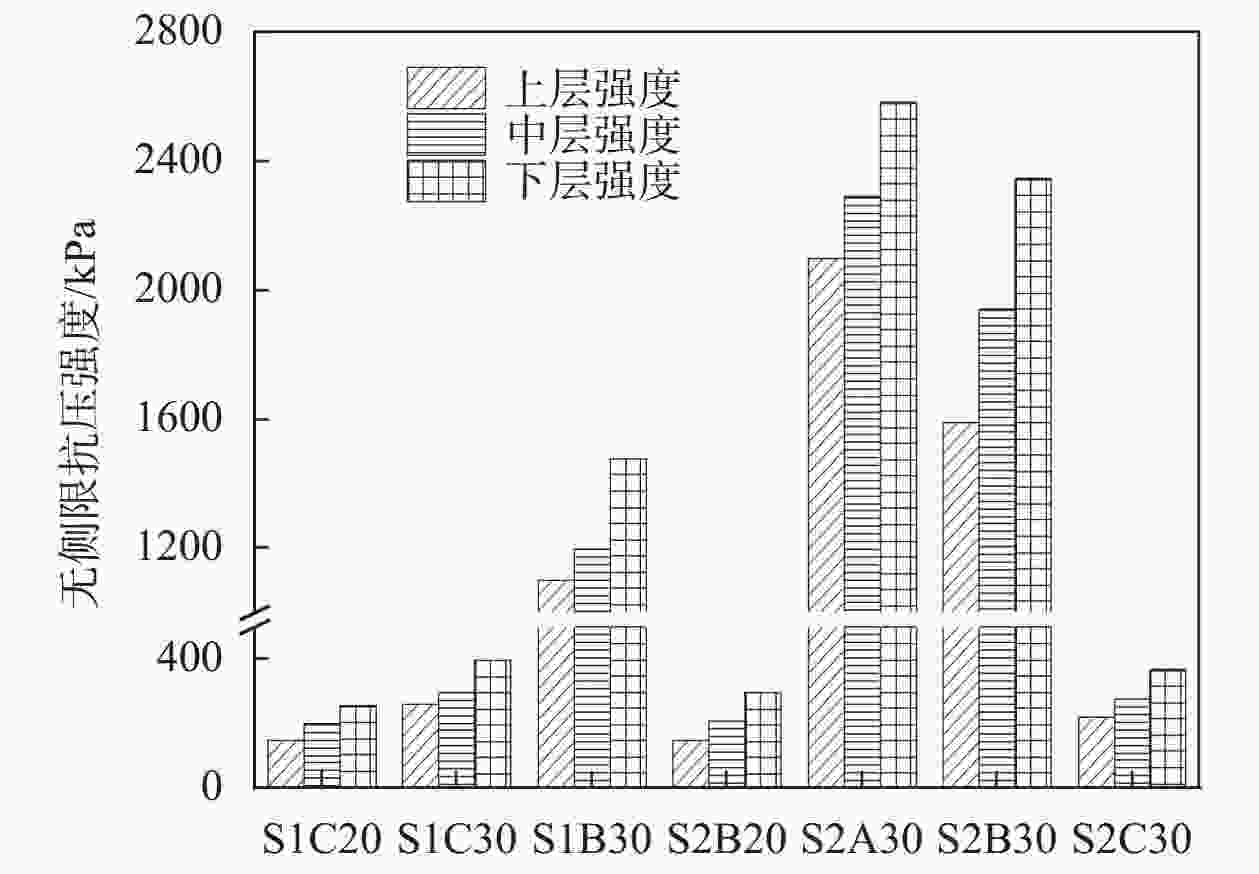 试样编号 抗压强度/kPa 上层 中层 下层 变异系数 S1C20 147.2 197.6 254.9 12.4 S1C30 258.20 297.90 397.92 18.3 S1B30 1100.87 1196.59 1479.61 15.6 S2C20 147.8 207.51 296.69 28.4 S2A30 2100.3 2290.6 2584.2 8.6 S2B30 1591.9 1941.88 2346.7 19.3 S2C30 217.7 277.2 367.2 26.2 -