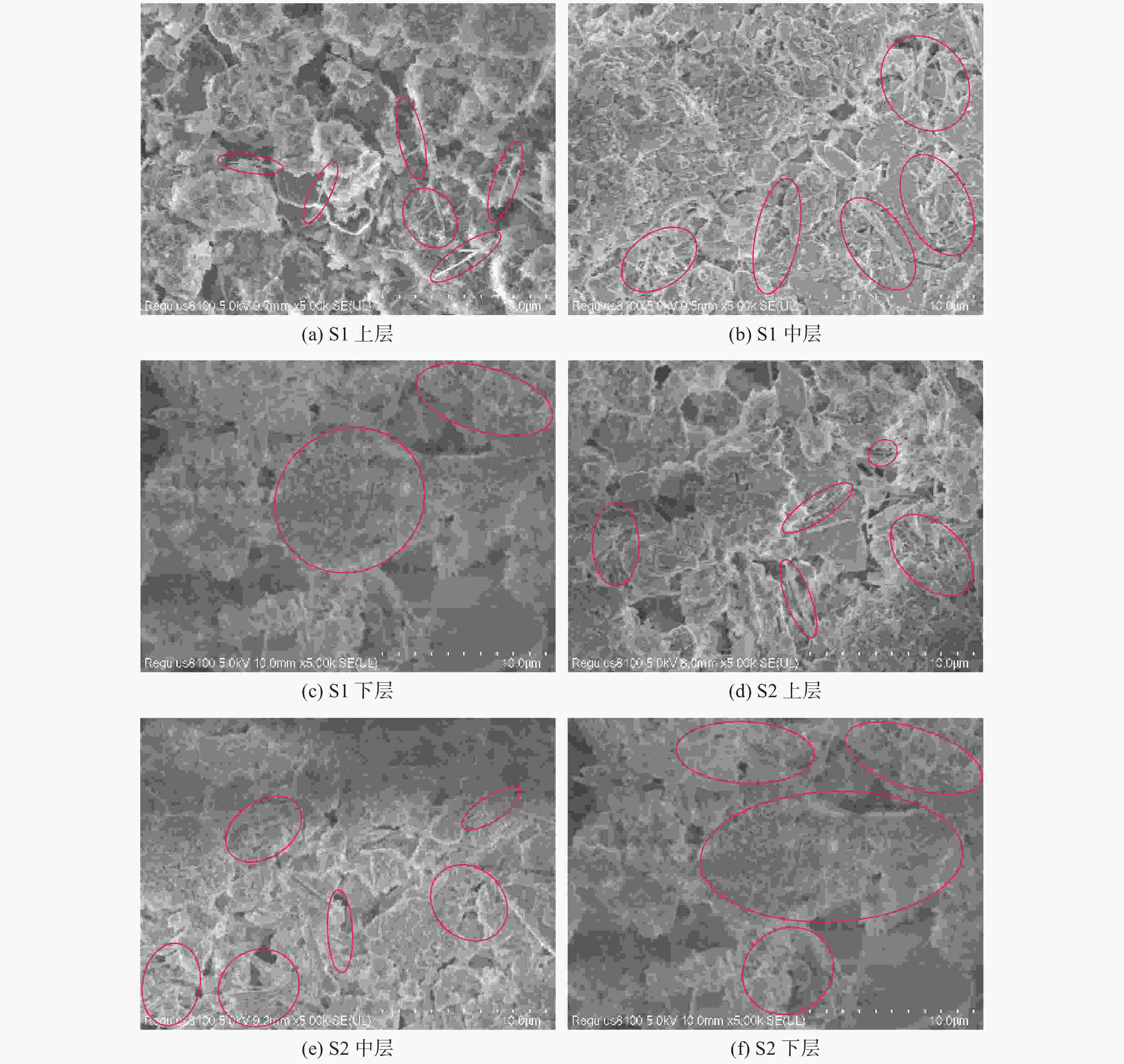 /(g∙cm−3)凝结时间/min 初凝 终凝 S1A20 730 530 20 1.44 1.51 1100 1430 S1B20 700 490 15 1.44 1.47 1250 1780 S1C20 720 500 14 1.45 1.53 1560 2420 S2A20 650 450 8 1.45 1.50 2020 2460 S2B20 660 460 5 1.43 1.46 2150 2670 S2C20 650 450 4 1.43 1.47 2960 3180 S1A30 720 510 21 1.44 1.51 1010 1320 S1B30 710 500 17 1.44 1.49 1180 1650 S1C30 720 500 15 1.45 1.52 1440 1880 S2A30 630 440 8 1.45 1.51 1880 2140 S2B30 640 460 6 1.43 1.46 1960 2230 S2C30 650 460 4 1.45 1.47 2540 2870 注:试样编号中,S1,S2分别表示试样母土类型;A,B,C分别表示所使用固化剂种类;20,30分别表示固化剂掺量(%)。 表 4 两种土不同层间强度试验结果