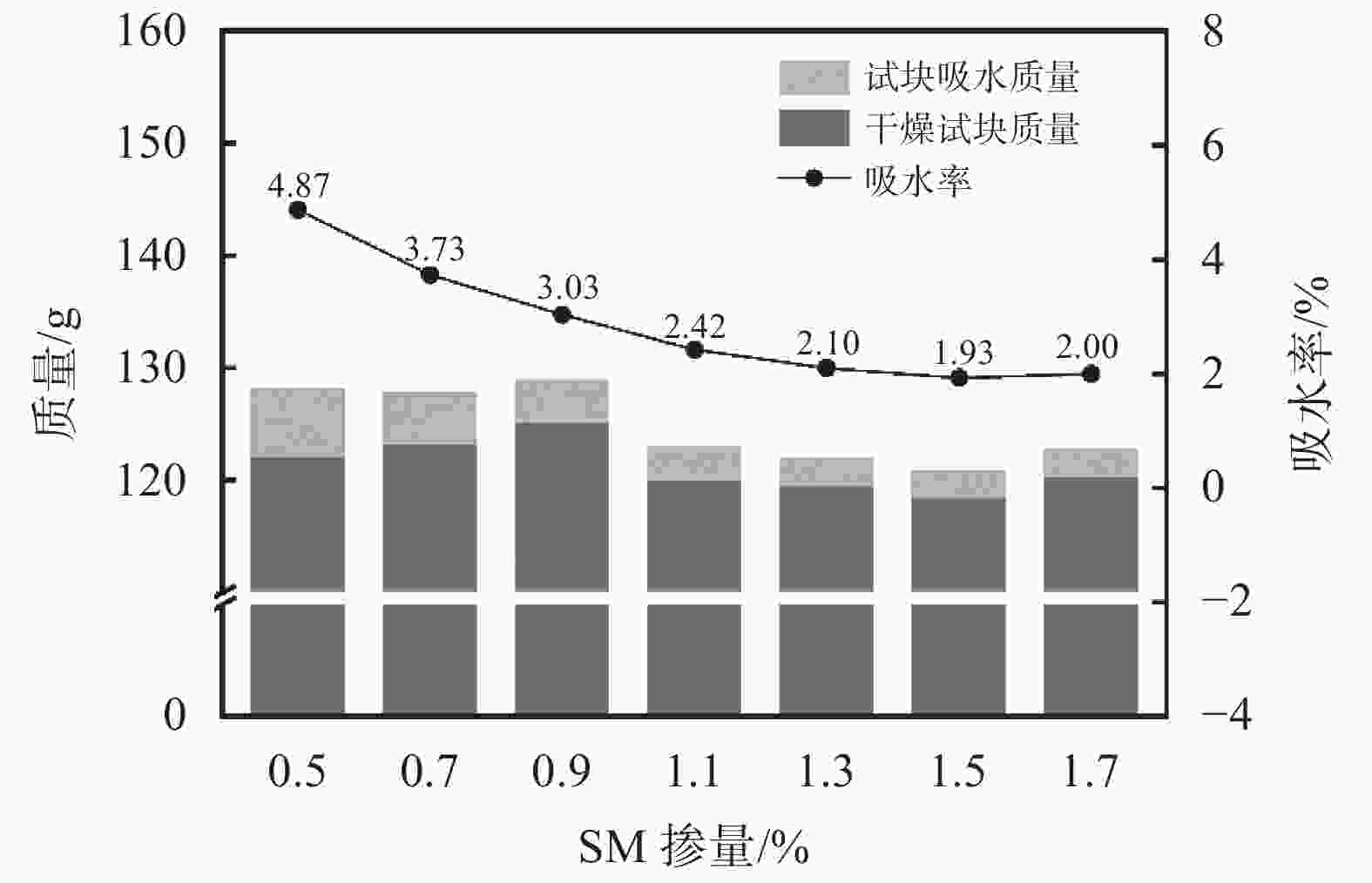 图  11  改性生土试块冲刷120 min吸水率随SM掺量的关系