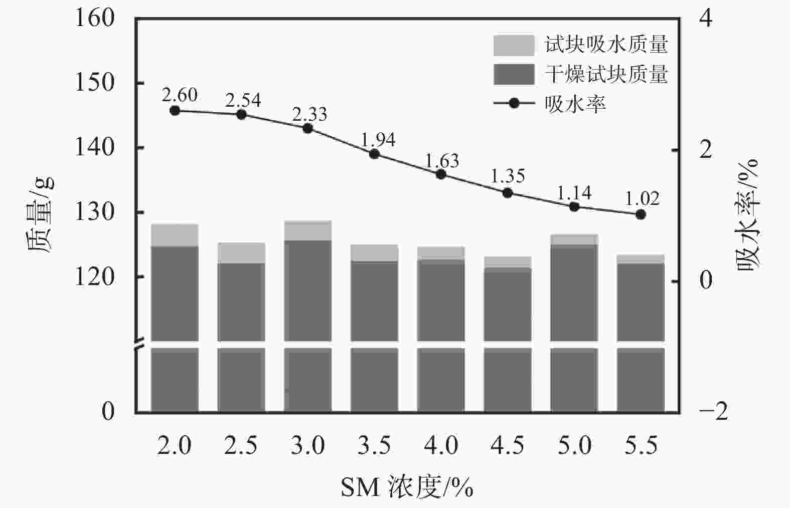 图  3  改性生土试块浸泡60 min吸水率随SM涂刷浓度的关系