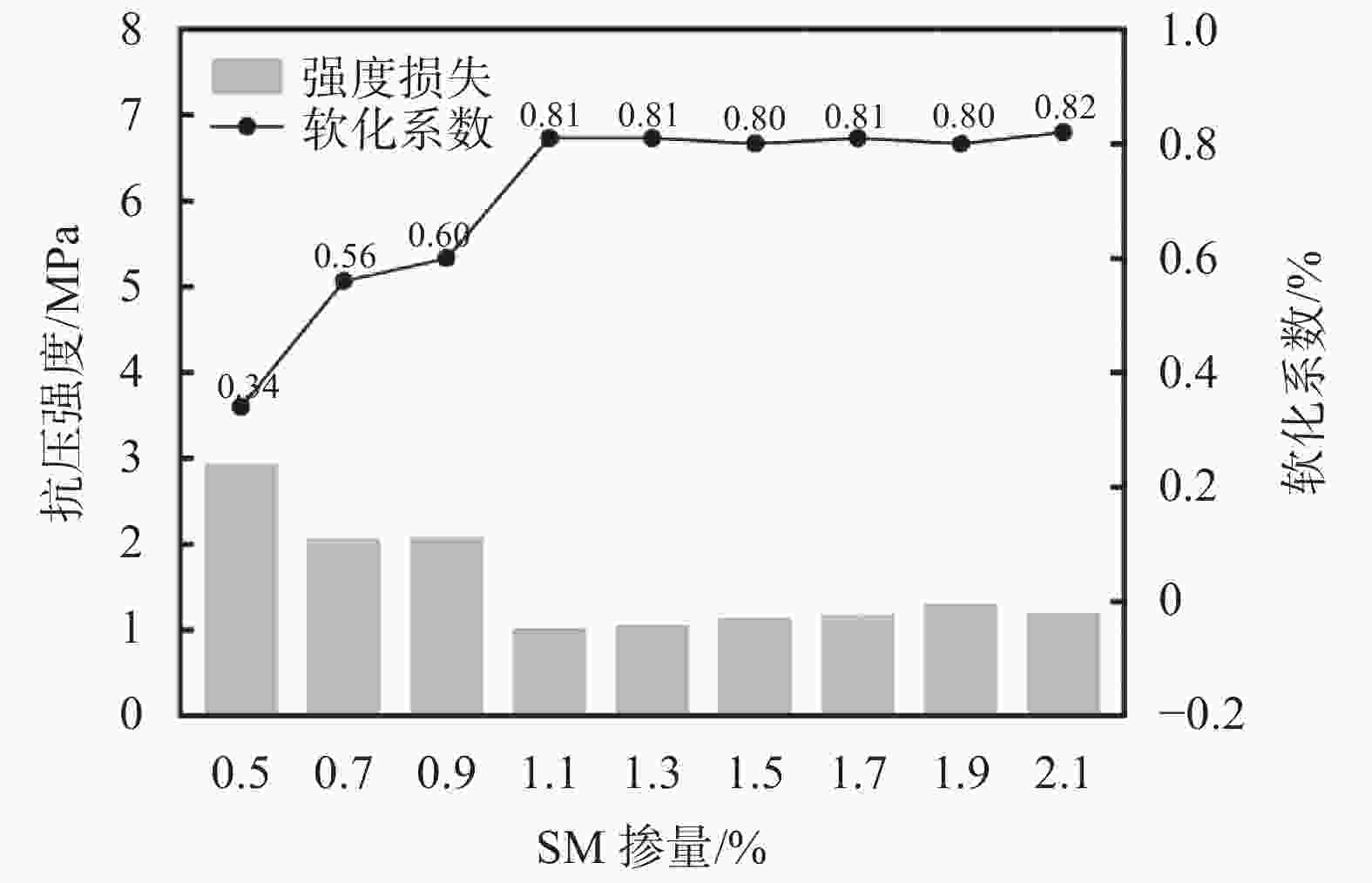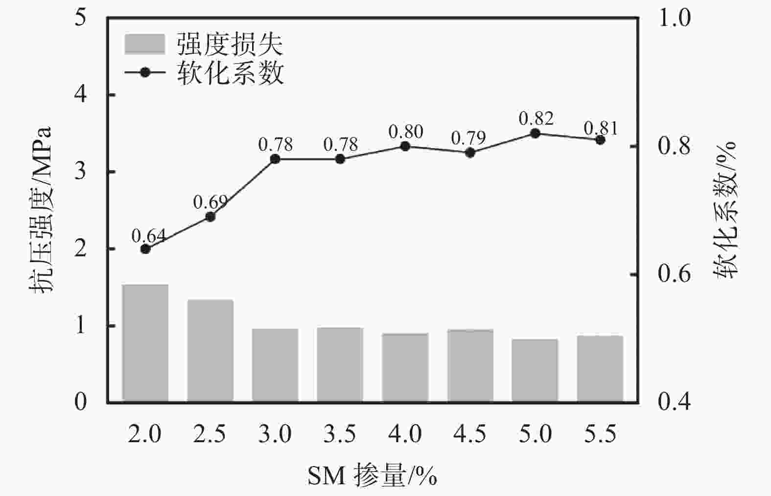 Figure  7.  Softening coefficient of the modified raw soil test block soaked for 60 min is related to the amount of SM