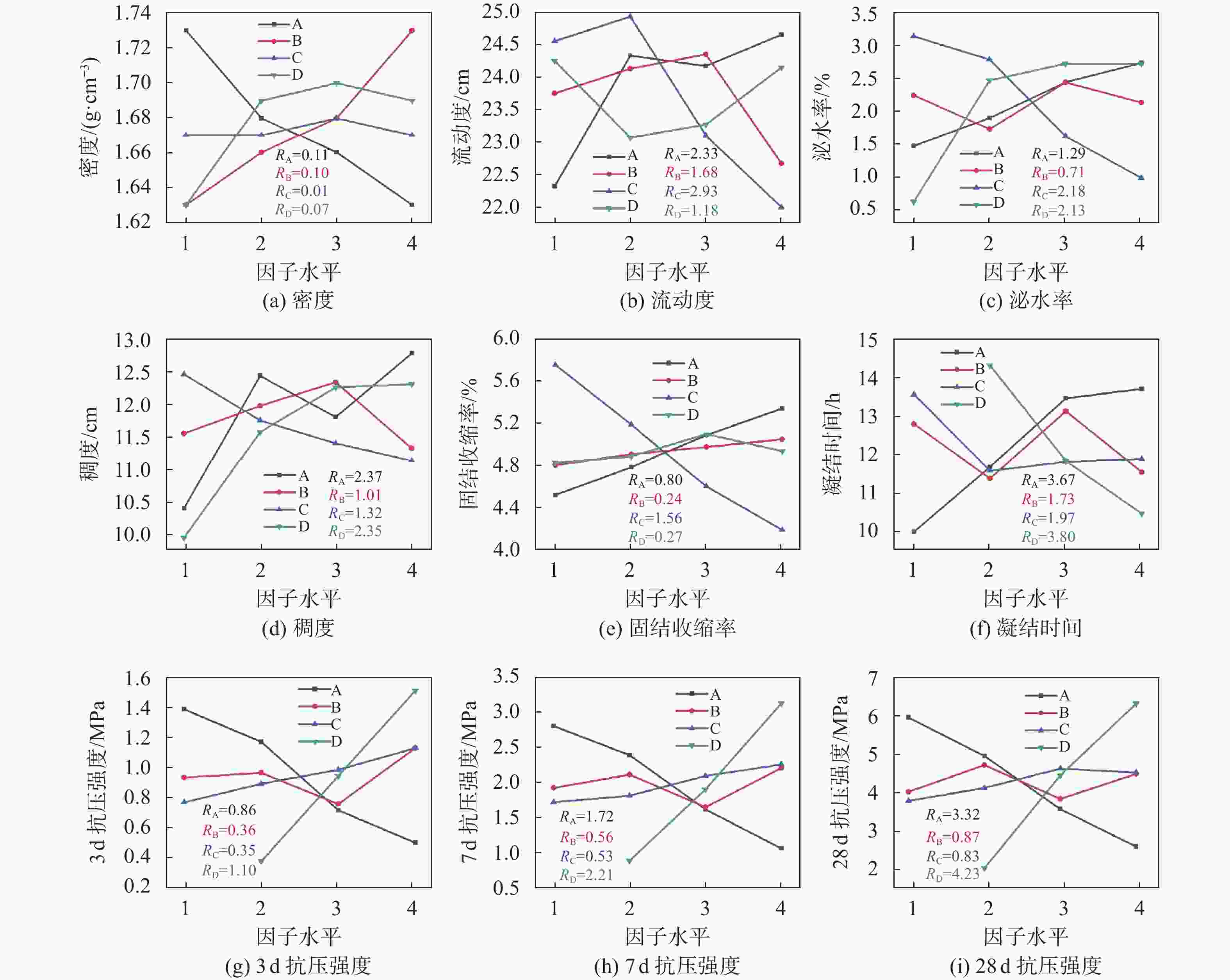 浆液编号 密度/(g·cm−3) 流动度/cm 泌水率/% 稠度/cm 固结收缩率/% 凝结时间/h 无侧限抗压强度/MPa 3 d 7 d 28 d 1 1.645 23.7 1.42 12.3 5.13 2 1.730 23.6 2.59 11.8 4.79 11.5 0.50 1.21 3.14 3 1.767 21.9 1.28 10.9 4.32 10.6 1.22 2.56 6.10 4 1.796 20.1 0.61 10.3 3.98 7.9 2.34 4.58 8.52 5 1.654 24.5 2.98 12.9 5.15 11.2 1.32 2.52 5.29 6 1.678 25.4 2.54 13.1 5.49 10.5 1.60 3.53 7.23 7 1.648 / 0.03 / 4.06 8 1.756 23.1 2.08 11.5 4.54 13.3 0.51 1.07 2.28 9 1.622 24.3 3.15 12.9 4.70 11.5 1.16 2.61 5.46 10 1.671 23.4 1.84 11.8 4.49 12.1 0.71 1.55 3.74 11 1.674 * 3.83 13.2 5.97 16.7 0.22 0.68 1.50 12 1.665 24.8 1.01 12.1 5.26 13 1.583 22.5 1.47 12.0 4.34 15.6 0.25 0.59 1.28 14 1.575 / 0.01 / 4.94 15 1.647 26.8 4.68 13.1 5.65 12.0 0.78 1.67 3.90 16 1.702 * 4.89 13.0 6.50 13.4 0.44 0.93 2.62 表 4 浆液基本性能极差分析结果