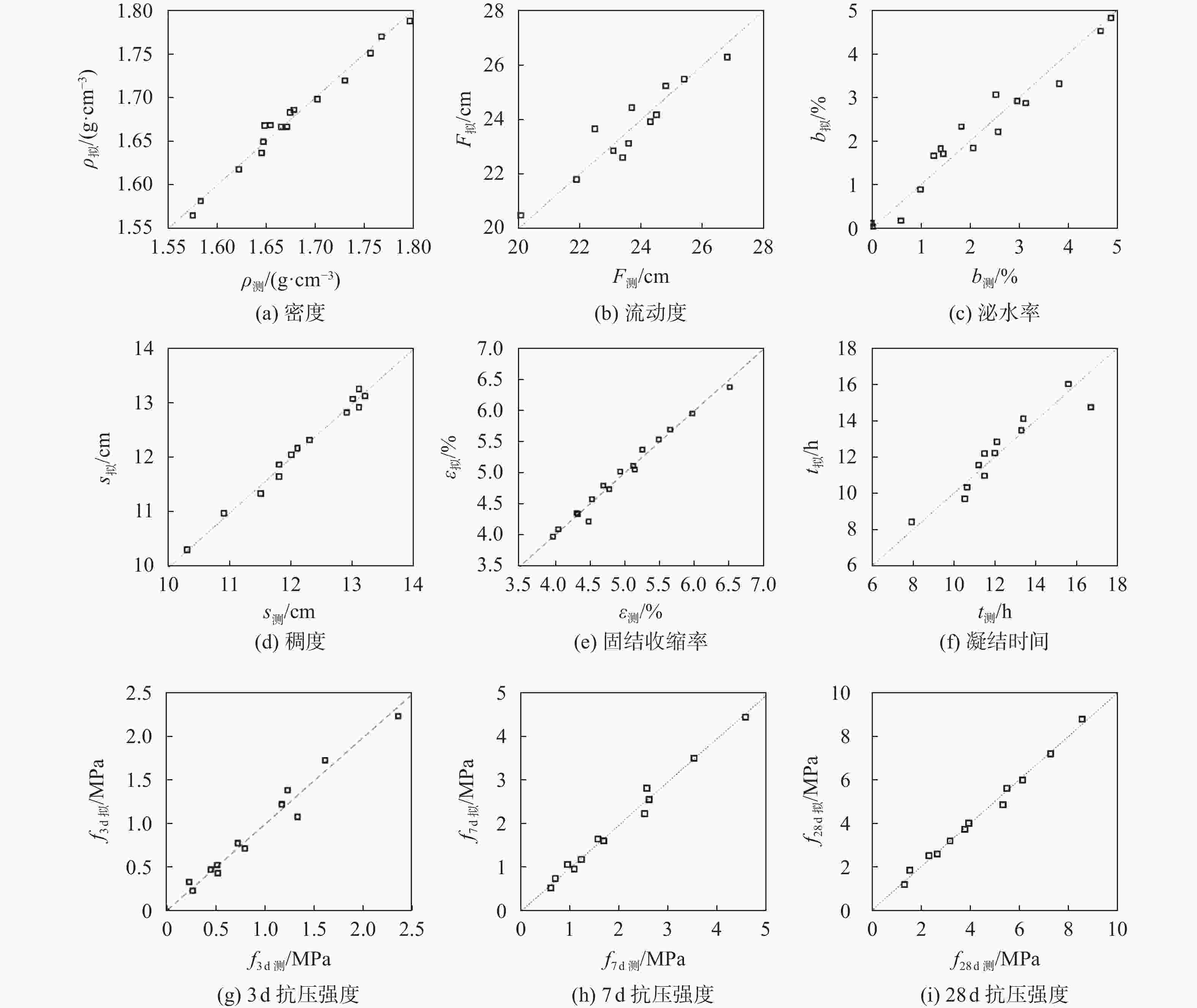 变量 回归公式 R2 $ R_{\mathrm{adj}}^2 $ 密度 ρ=1.78−0.349A+0.166B+0.33D−0.408D2 0.979 0.972 流动度 F=20.73+10.56A−26.25C 0.888 0.863 泌水率 b=4.01−1.57A−12.28C−4.59D−11.73D2+19.93AD 0.949 0.923 稠度 s=1.99+30.47A−1.299B−11.058C+0.711D−17.54A2 0.986 0.978 固结收缩率 ε=2.167+6.171A+4.36C−19.82AC 0.981 0.976 凝结时间 t=6.42+12.77A−9.5D 0.883 0.856 3 d抗压强度 f3d=−0.962+1.043A+10.4D−10.2AD 0.967 0.955 7 d抗压强度 f7d=−1.362+1.48A+19.4D−18.5AD 0.987 0.982 28 d抗压强度 f28d=1.57−2.06A+27.95D−23.18AD 0.992 0.989 表 6 优化浆液试验结果验证