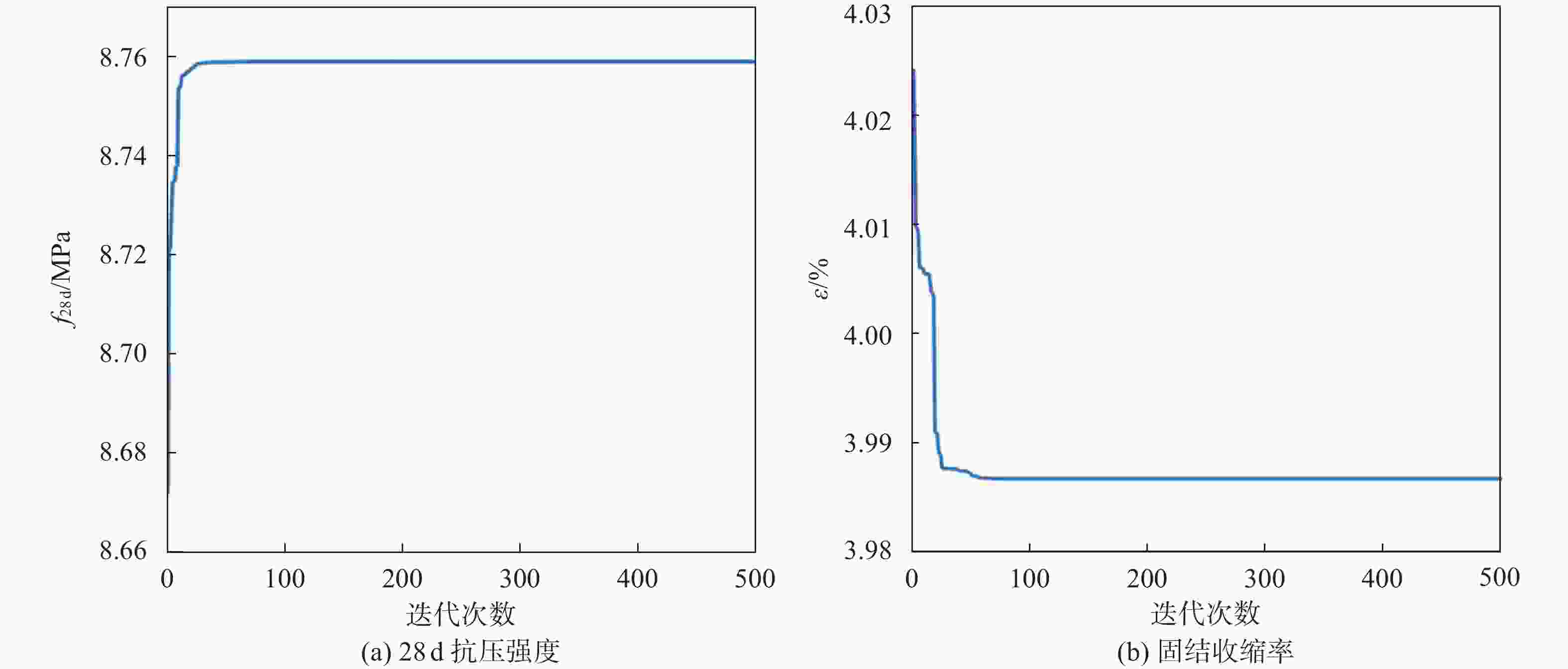 /cm固结收缩率/% 凝结时间/h 无侧限抗压强度/MPa 3 d 7 d 28 d fmincon函数 最优配比试验值 1.806 19.9 1.2 11.5 4.43 7.9 2.10 4.31 8.15 最优配比理论值 1.756 21.3 0.56 10.9 4.21 8.4 2.23 4.51 8.76 误差率/% 2.77 7.04 53.33 5.22 4.97 6.33 6.19 4.64 7.48 改进NSGA-II算法 最优配比试验值 1.844 19.5 0.29 10.2 4.11 8.0 2.16 4.36 8.20 最优配比理论值 1.766 20.5 0.2 10.5 3.99 8.4 2.23 4.51 8.76 误差率/% 4.23 5.13 31.03 2.94 3.16 5.00 3.24 3.44 6.83 表 7 优化算法对比