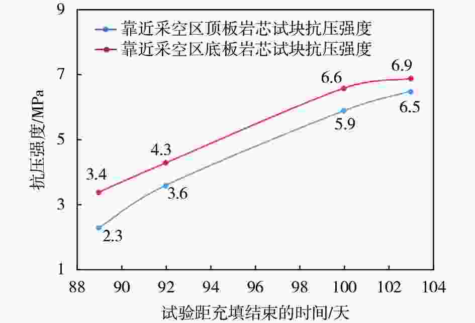 强度/MPa测试孔1 1-1(靠近顶板) 92 3.6 3.6 92 4.3 92 3.1 1-2(靠近底板) 92 4.3 4.3 92 4.5 92 4.0 测试孔2 2-1(靠近顶板) 95 5.1 5.0 95 5.0 95 5.1 2-2(靠近底板) 95 5.8 5.8 95 5.9 95 5.8 测试孔3 3-1(靠近顶板) 89 2.2 2.3 89 2.1 89 2.6 3-2(靠近底板) 89 3.6 3.4 89 2.9 89 3.9 测试孔4 4-1(靠近顶板) 103 6.1 6.5 103 6.5 103 7.0 4-2(靠近底板) 103 7.3 6.9 103 6.8 103 6.7 测试孔5 5-1(靠近顶板) 100 6.1 5.9 100 5.5 100 6.0 5-2(靠近底板) 100 6.2 6.6 100 7.0 100 6.5 表 4 沉降观测变化值