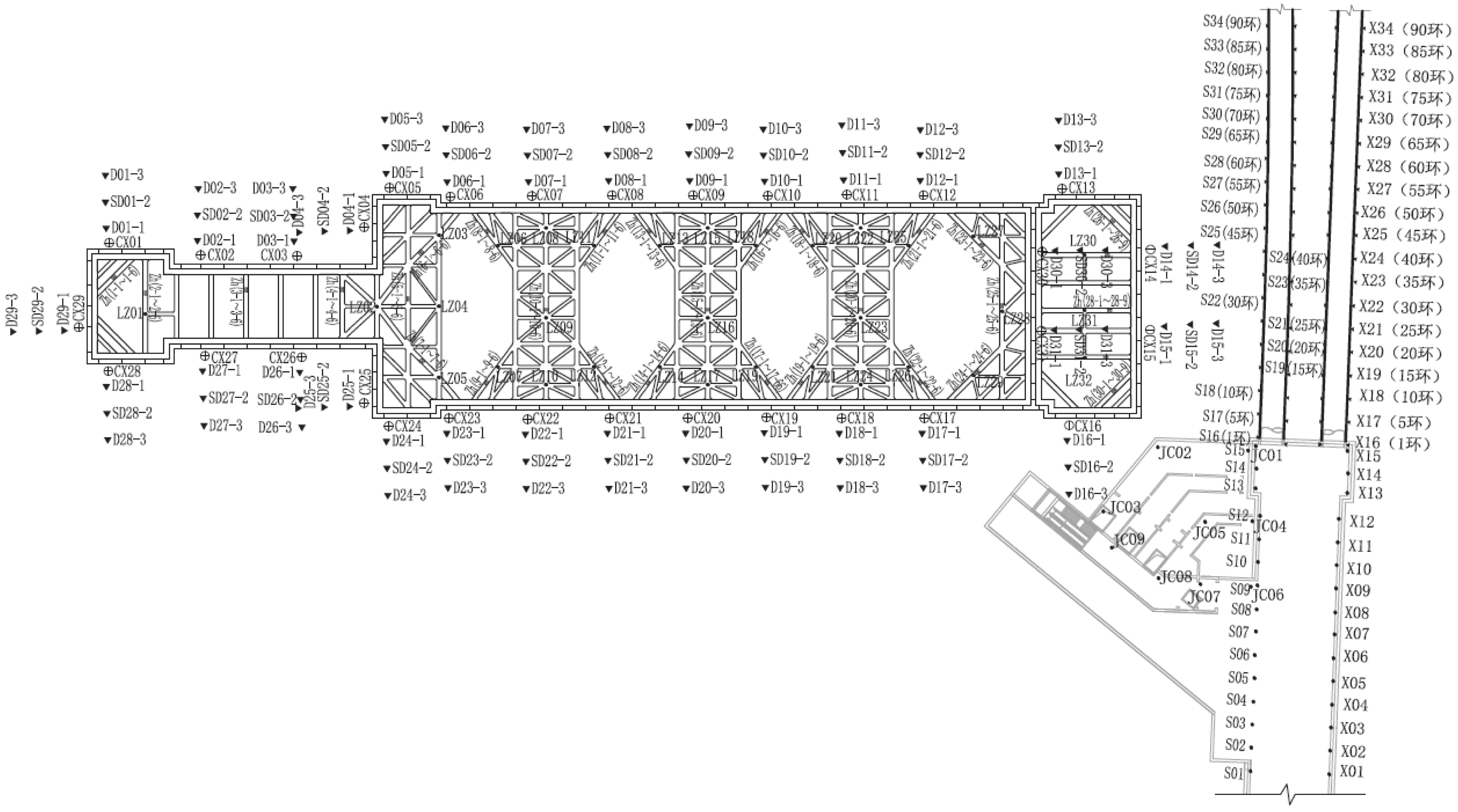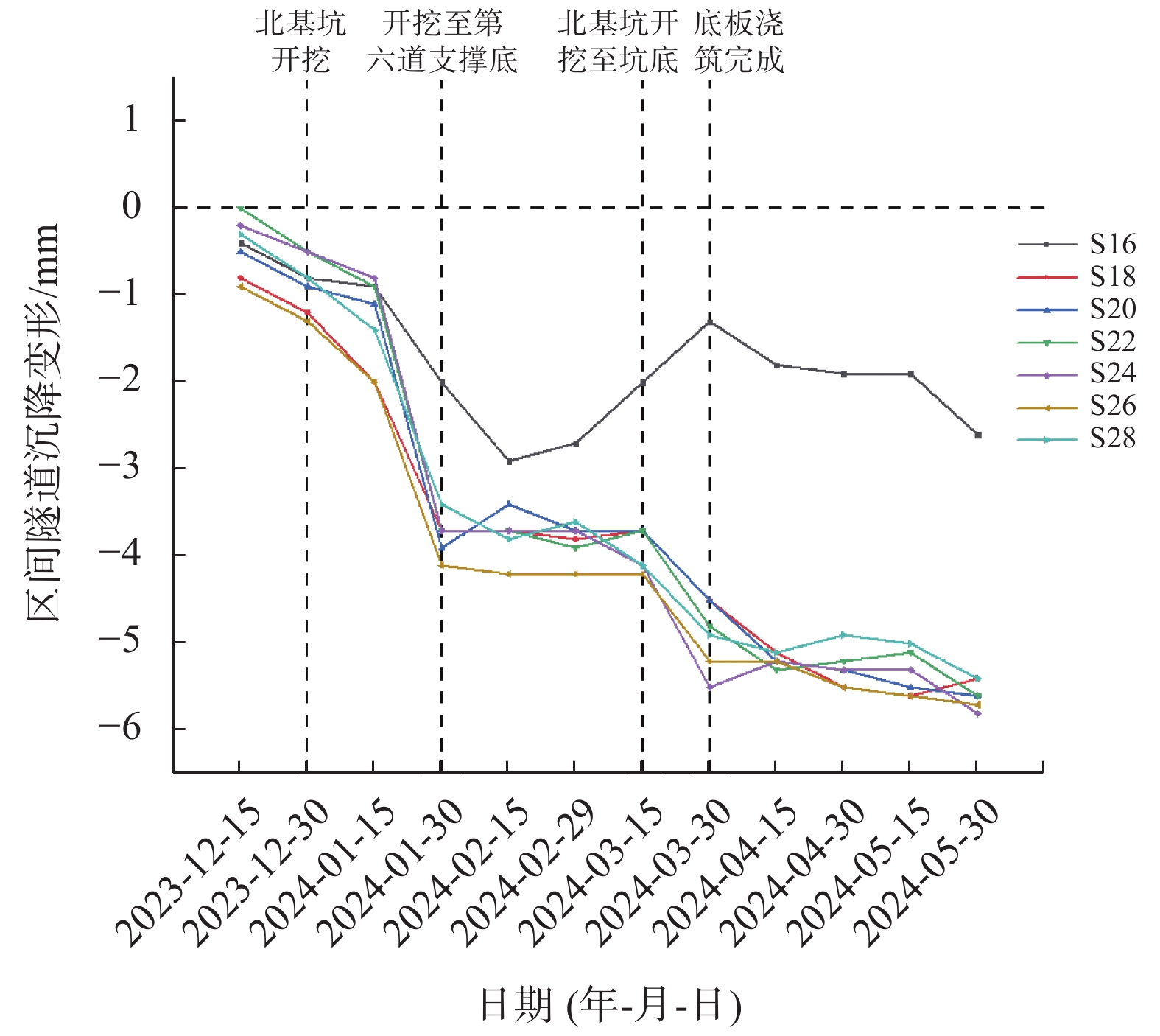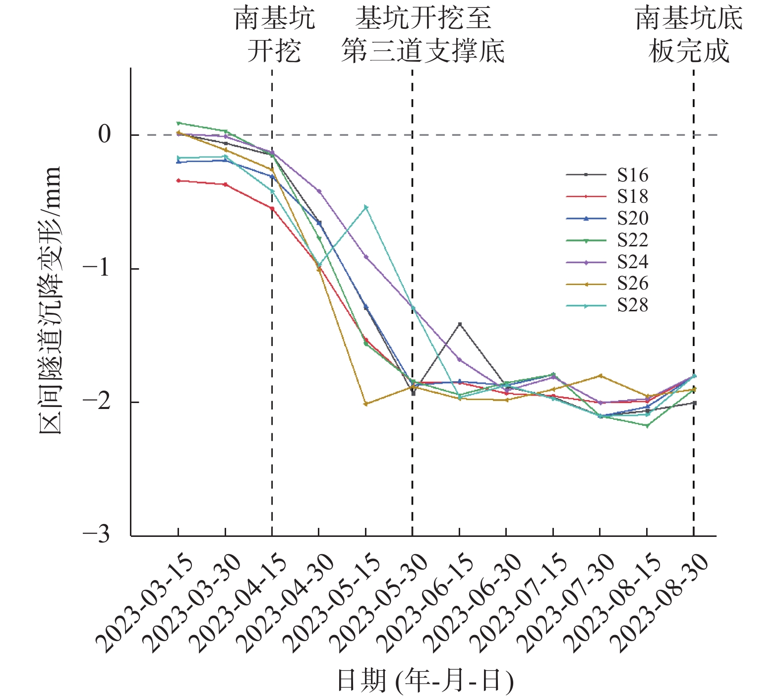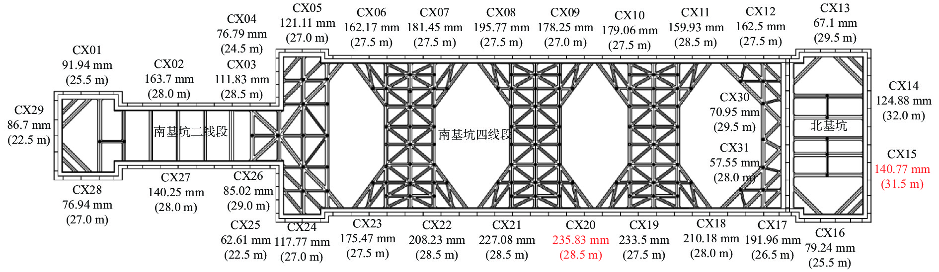 宁波轨道交通7号线小洋江站为多线换乘地下三层车站,基坑长度270.8 m,四线段基坑宽度51.4~55.7 m,两线段基坑宽度19.6~27.3 m,基坑深度27~31 m。车站建设场地存在深厚软土,基坑北侧距已运营的区间隧道约30.8 m,基坑变形控制要求较高。为控制基坑与邻近区间隧道变形,基坑围护设计采用地连墙+内支撑体系,同时采用硬分坑分时分段施工、软分坑分层开挖、地连墙构造段加长切断承压水层及设置施工便道与栈桥等一系列措施。监测结果表明,基坑大阳角采用软分坑与分层开挖的方式,对其变形控制非常有效;地表沉降对于坑外荷载较为敏感,坑外存在长期荷载区域地表沉降远大于其余区域;基坑开挖对邻近区间隧道存在影响,开挖深度小于隧道埋深时,对区间隧道影响较大,而开挖深度超过隧道埋深时,对区间隧道影响相对较小,最终区间隧道沉降为5.9 mm,控制在允许范围内。