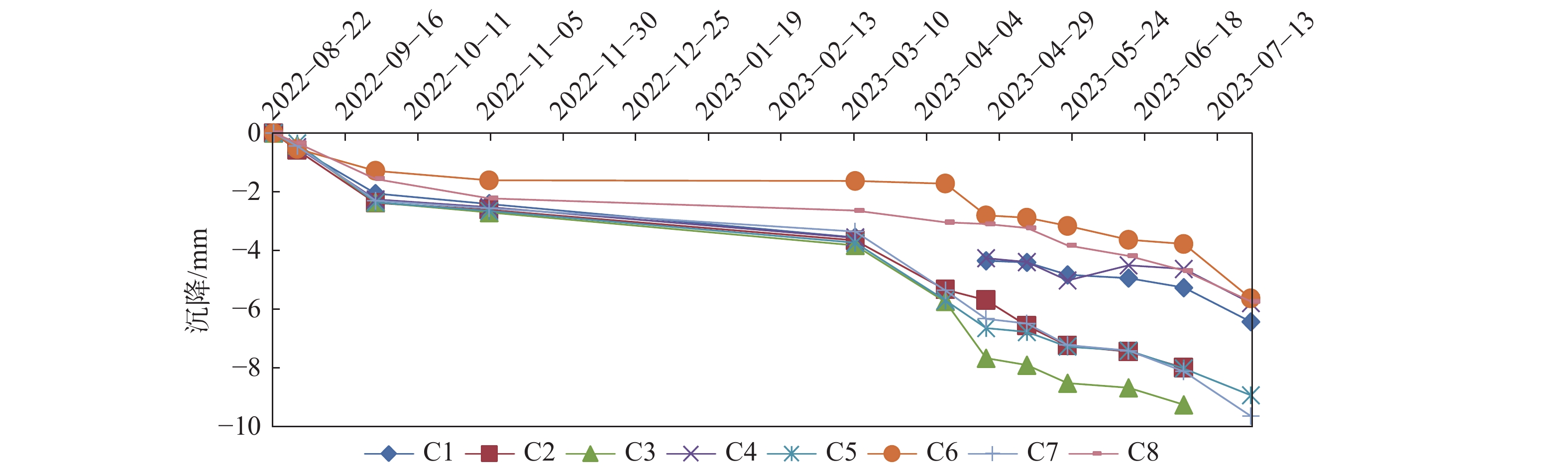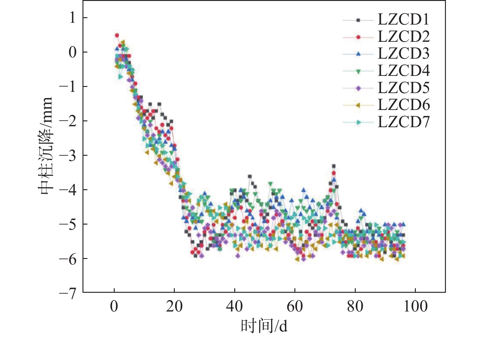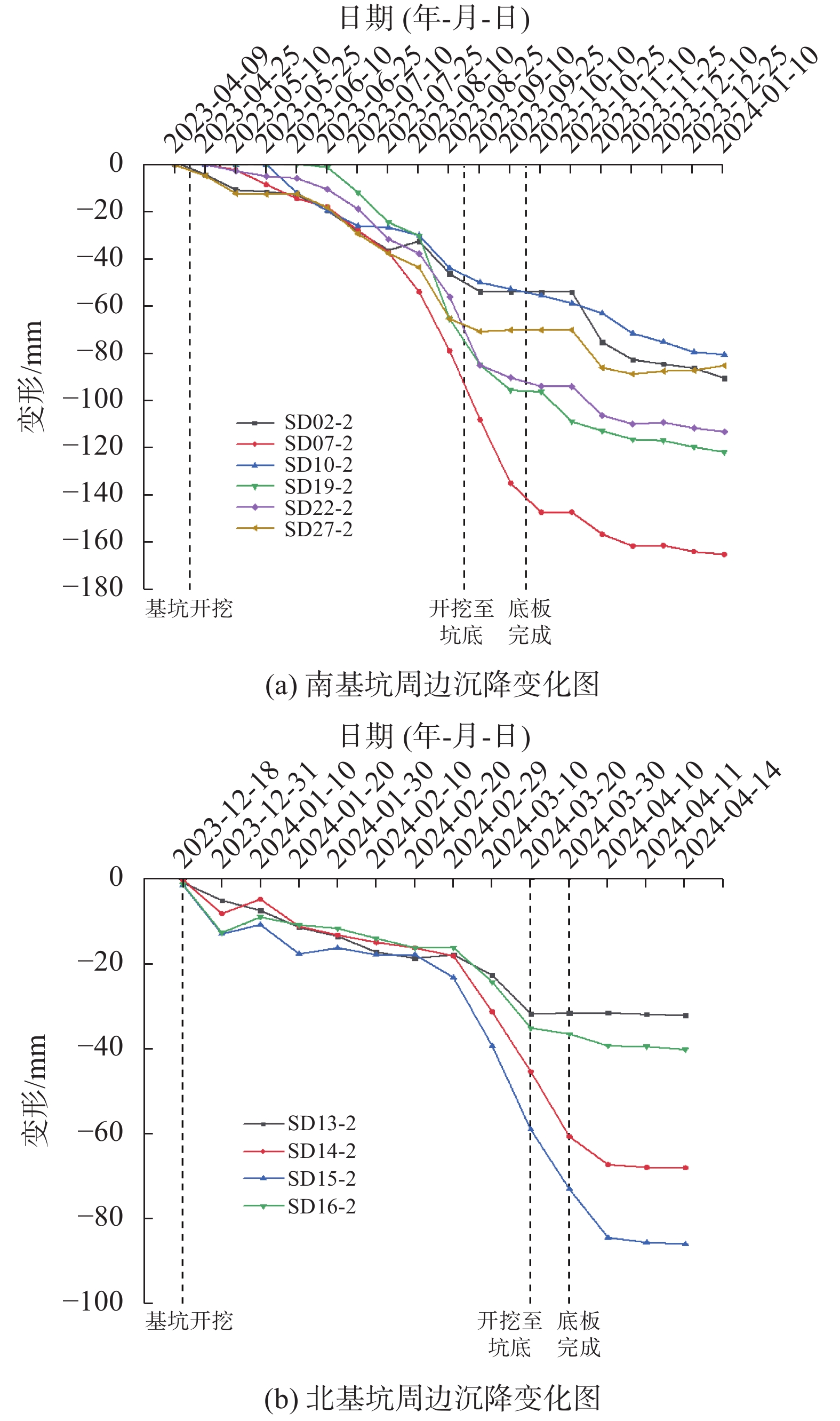 宁波轨道交通7号线小洋江站为多线换乘地下三层车站,基坑长度270.8 m,四线段基坑宽度51.4~55.7 m,两线段基坑宽度19.6~27.3 m,基坑深度27~31 m。车站建设场地存在深厚软土,基坑北侧距已运营的区间隧道约30.8 m,基坑变形控制要求较高。为控制基坑与邻近区间隧道变形,基坑围护设计采用地连墙+内支撑体系,同时采用硬分坑分时分段施工、软分坑分层开挖、地连墙构造段加长切断承压水层及设置施工便道与栈桥等一系列措施。监测结果表明,基坑大阳角采用软分坑与分层开挖的方式,对其变形控制非常有效;地表沉降对于坑外荷载较为敏感,坑外存在长期荷载区域地表沉降远大于其余区域;基坑开挖对邻近区间隧道存在影响,开挖深度小于隧道埋深时,对区间隧道影响较大,而开挖深度超过隧道埋深时,对区间隧道影响相对较小,最终区间隧道沉降为5.9 mm,控制在允许范围内。