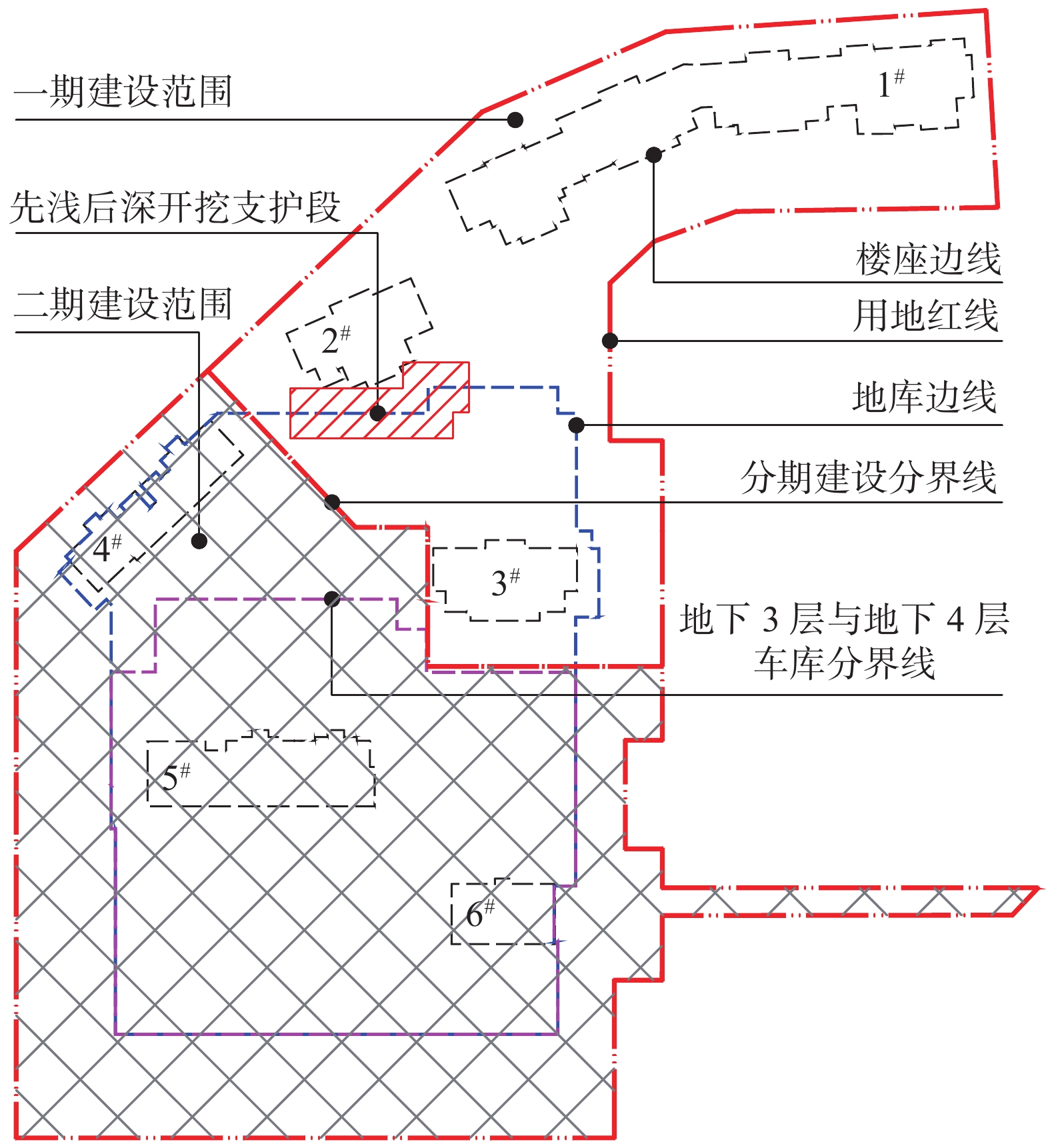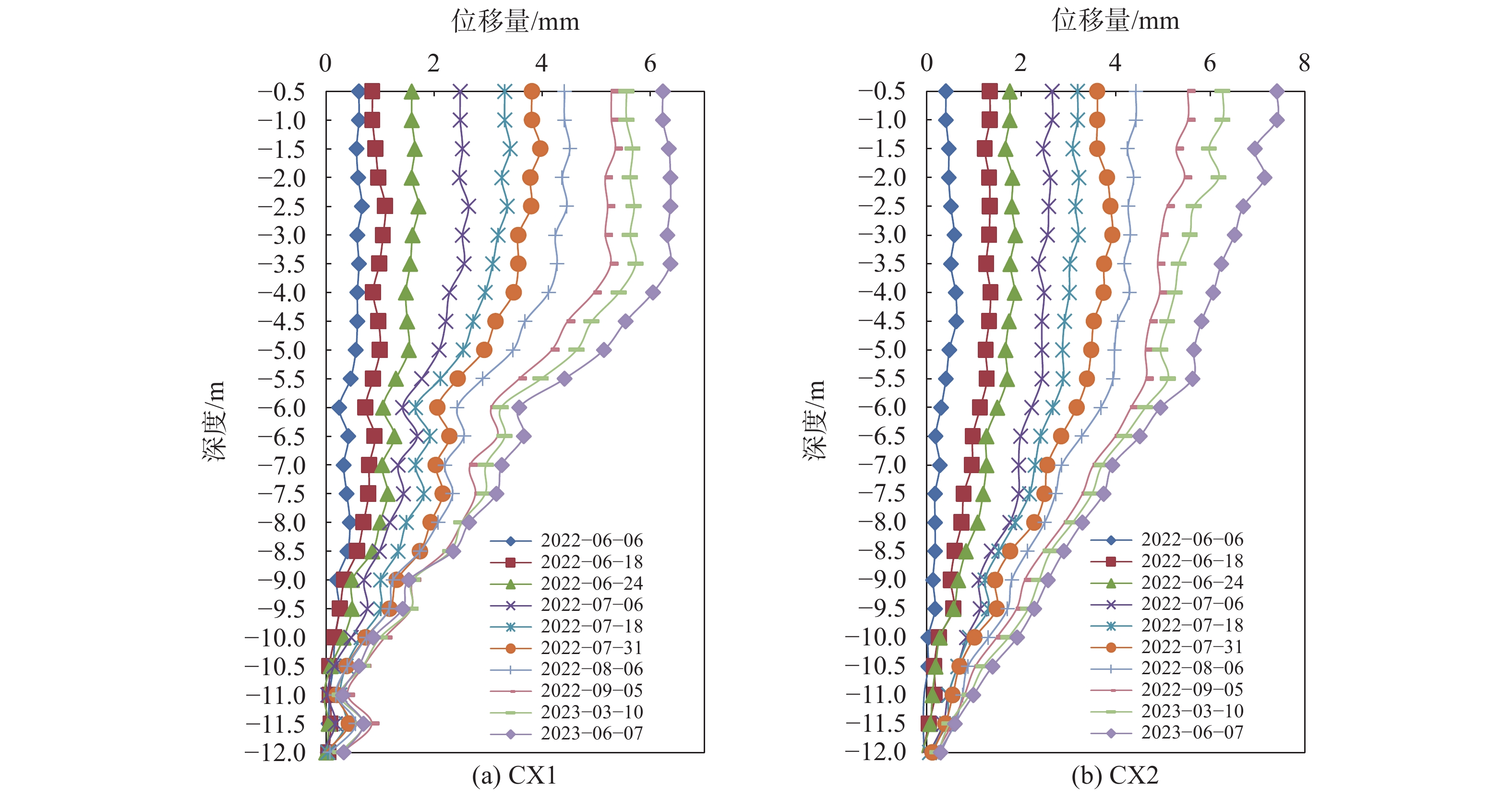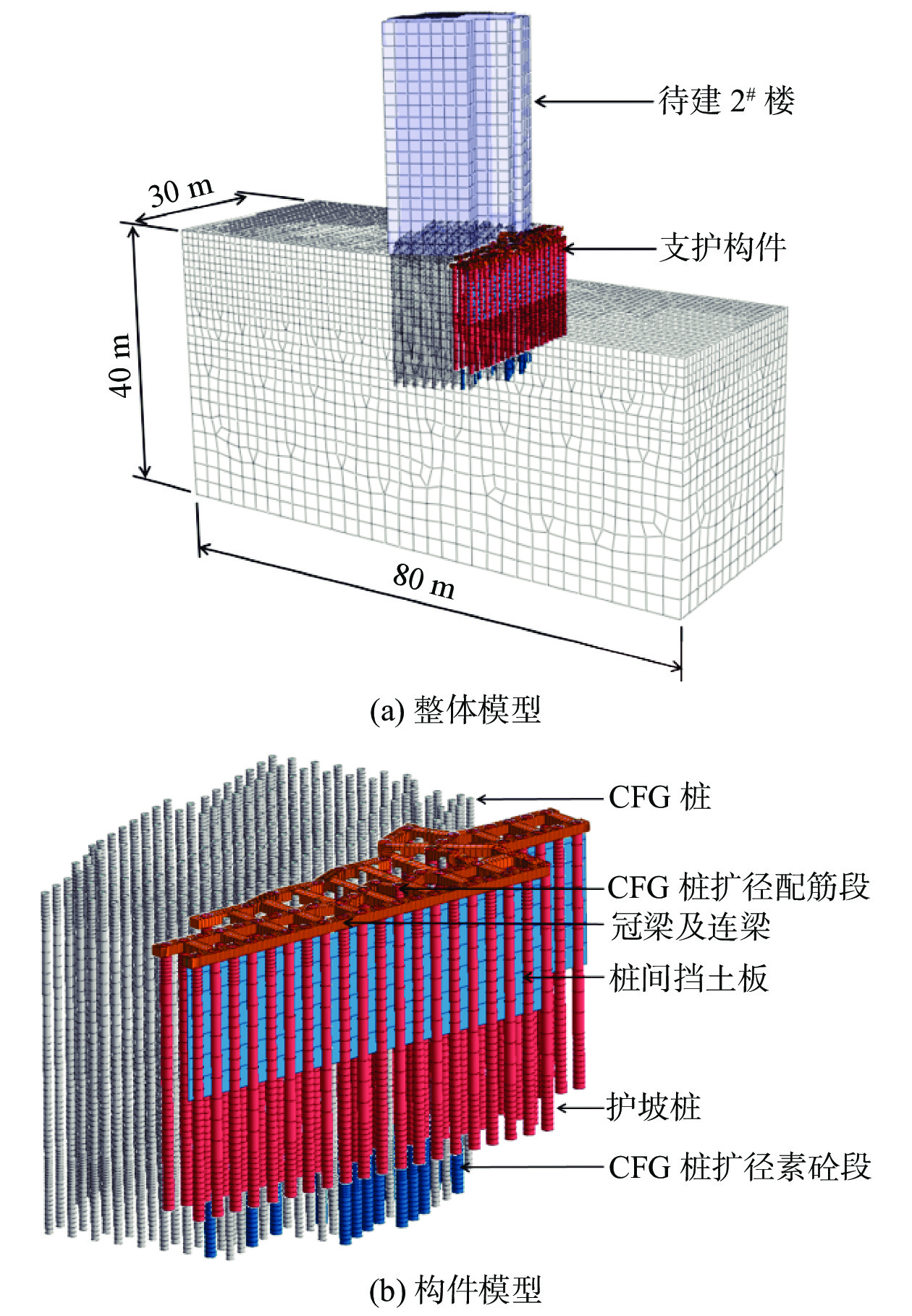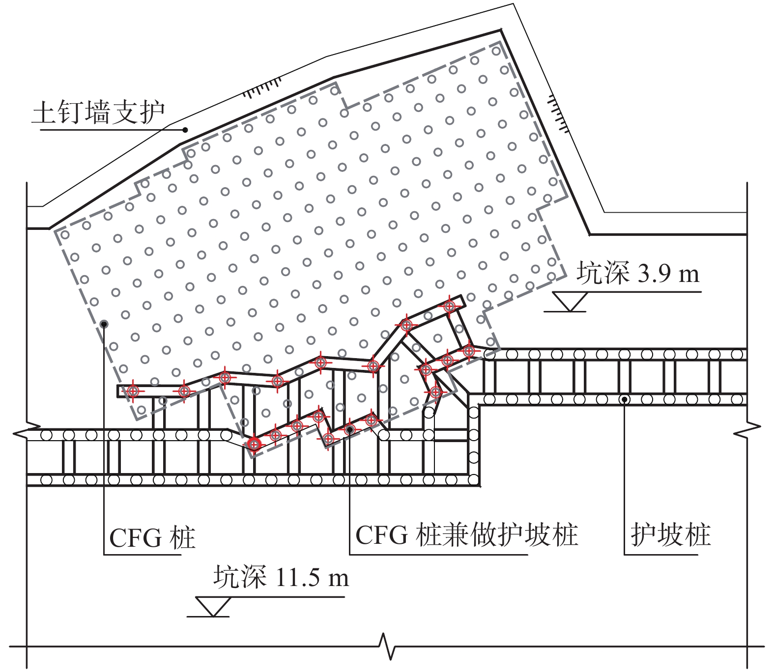 北京地区某建筑项目高层住宅楼与纯地下车库毗邻,二者基础高差7.6 m,根据施工进度安排,位于浅部的住宅楼需先于车库施工,毗邻段车库基坑支护设计需考虑最不利工况,即住宅结构封顶时车库基坑肥槽尚未回填。为有效控制深部基坑与浅部住宅楼变形,对深部基坑采用结合浅部住宅楼CFG桩的三排桩支护方案。数值模拟和基坑变形监测表明,深部基坑变形和浅部住宅沉降及倾斜均处于可控范围,浅部住宅楼荷载绝大部分通过CFG桩传递至深部地层中,对深部基坑影响较小。本方案中CFG桩兼作竖向承载和水平承载构件,可采用扩径和配筋相结合的措施增加其侧向刚度,同时需要注意控制复合地基承载力和刚度的均匀性。