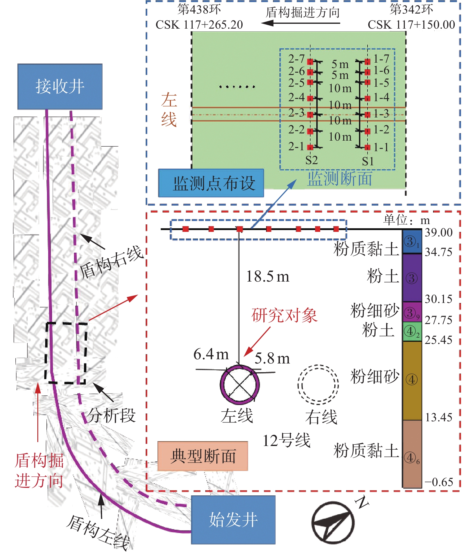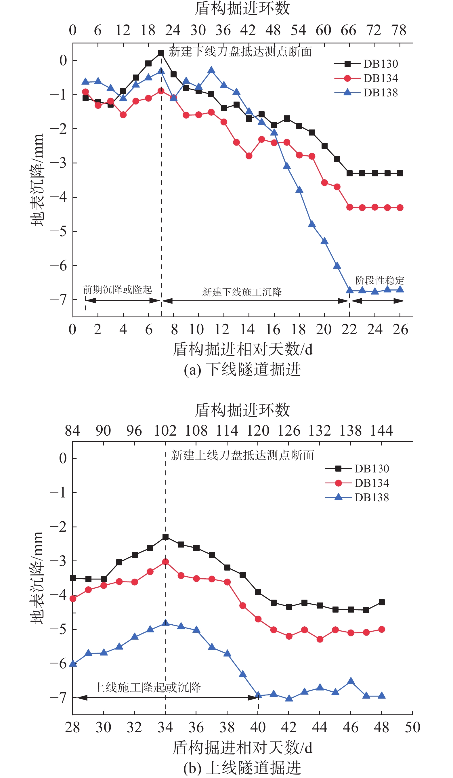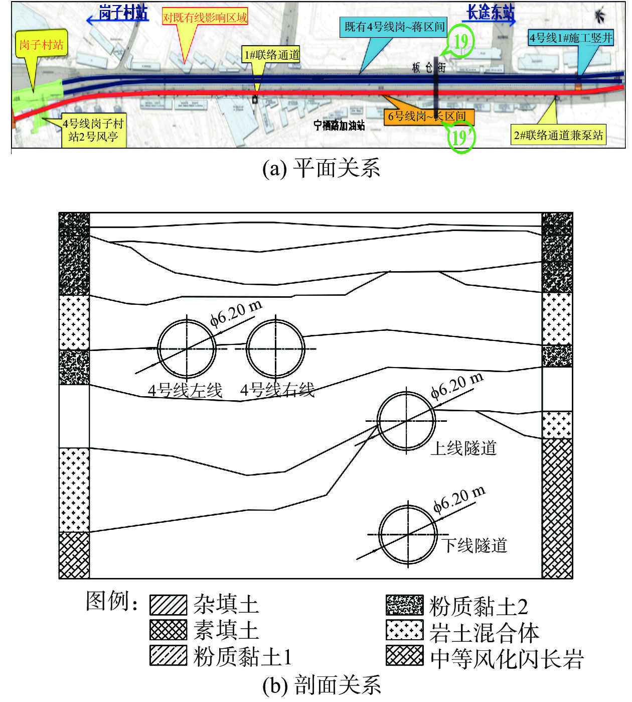 针对邻近既有营运线叠线隧道盾构施工的变形控制难题,依托南京地铁6号线岗子村—花园路区间工程,采用“先下后上”、注浆隔离加固和下线隧道台车系统支撑的施工技术,通过实测,分析叠线隧道盾构施工引起的地表沉降变化规律与盾构掘进对邻近既有营运线管片产生的影响,得到全过程地表沉降及既有隧道变形规律,结果表明:(1)下线隧道掘进时地表沉降随掘进相对时间先隆起,达到最大值后再沉降,直至趋于稳定,上线隧道掘进地表沉降规律相似;受注浆隔离加固影响,既有隧道地表沉降变化不明显,地表沉降曲线总体符合非对称的Peck曲线。(2)盾构掘进时,注浆压力增大,地表竖向位移日变量相应增加;盾构总推力与刀盘扭矩变化对地表竖向位移无明显影响。(3)上线隧道掘进时,下线隧道变形由“圆形”向“竖椭圆形”发展;下线隧道在台车支撑作用下,道床竖向位移与隧道水平收敛值相比无台车支撑时减少50%。(4)上线掘进完成后,拱顶和道床最终沉降最大分别为2.6 mm和2.5 mm,左右拱腰最大水平位移分别为0.3 mm和0.7 mm,呈向叠线隧道方向移动趋势。