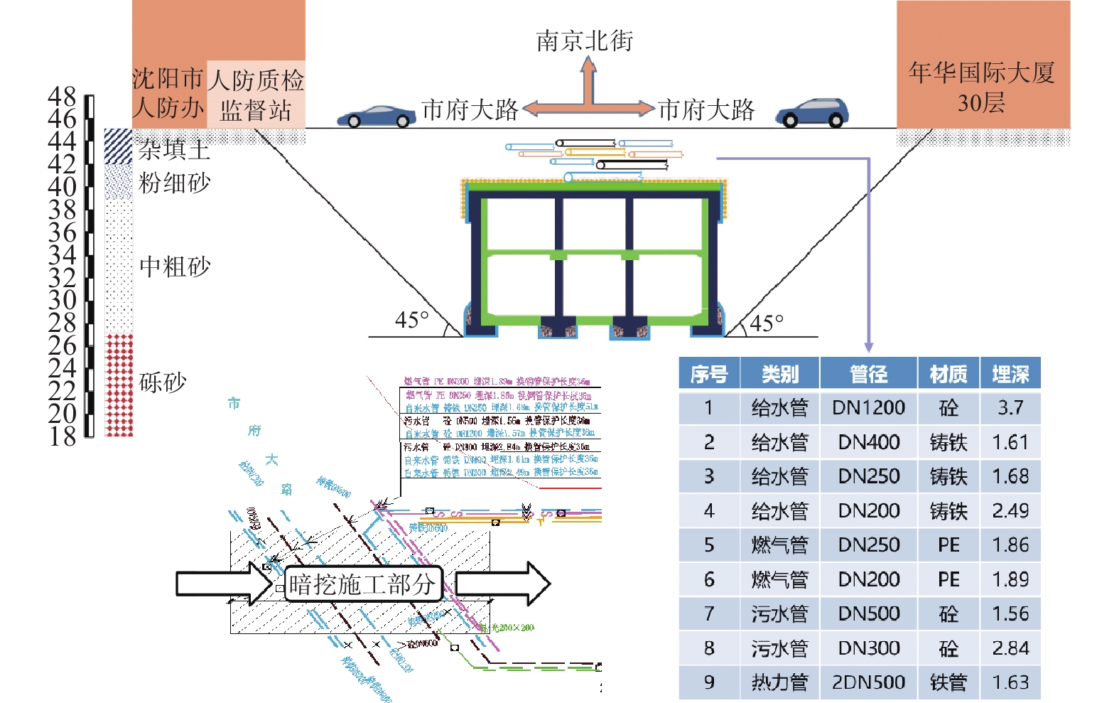上海市城市道路发生的地面塌陷主要原因为浅部砂层分布区域地下排水管线渗漏引发流砂,导致地下土体流失,地表硬壳层承载力下降。将有限元和离散元二者进行耦合,从管线渗漏位置和对邻近管线影响两个方面诱发地下空洞机理进行数值模拟研究。研究结果表明,管道表面顶部局部渗漏引起地表以下土体流失量最大,底部渗漏造成的影响范围较小;管道断裂渗漏引起的地面塌陷范围比管道局部渗漏大得多,但深度较管道顶部局部渗漏引起的塌陷深度小;邻近管道埋深越大,地表以下土体流失量越大,引起塌陷影响区域范围越大,而埋深较浅时,其所受邻近渗漏管道的影响较大;在对地面塌陷进行监测与预防时,不应仅关注地表沉降变形,关注管道周边的土体变形是一种更加及时有效的方法。